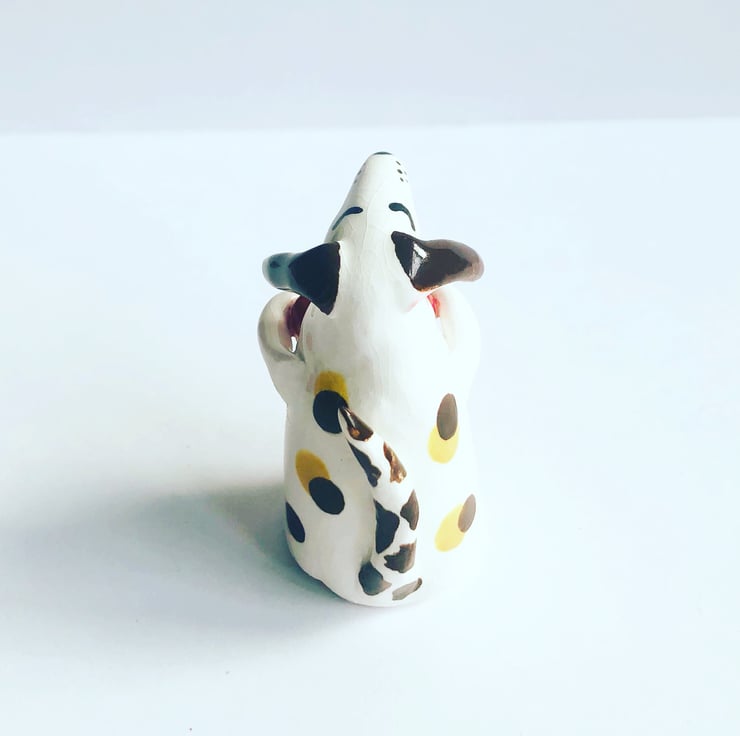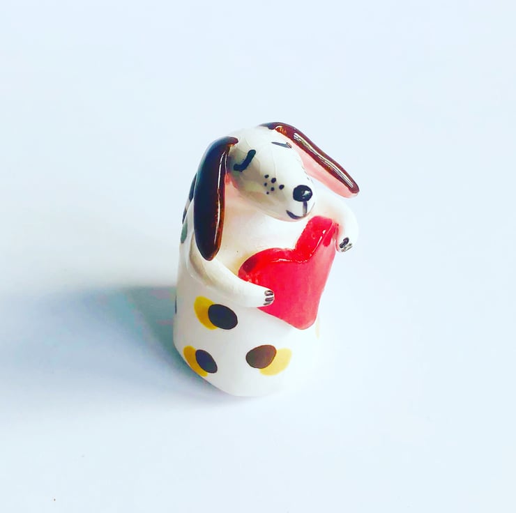 This cute “Love Dog” is handmade from porcelain clay and decorated with colourful underglazes. He has then been fired twice in the kiln - the second firing with a transparent glossy glaze. He measures 6.5cm tall. Ideal for keeping Makes a beautiful gift at any time of year for a dog lover!
