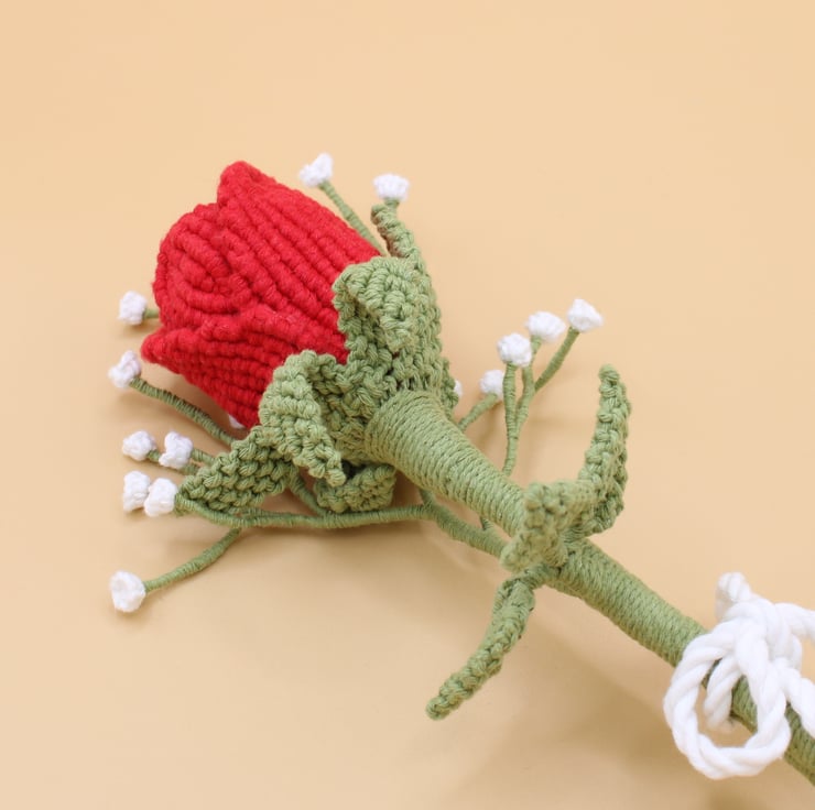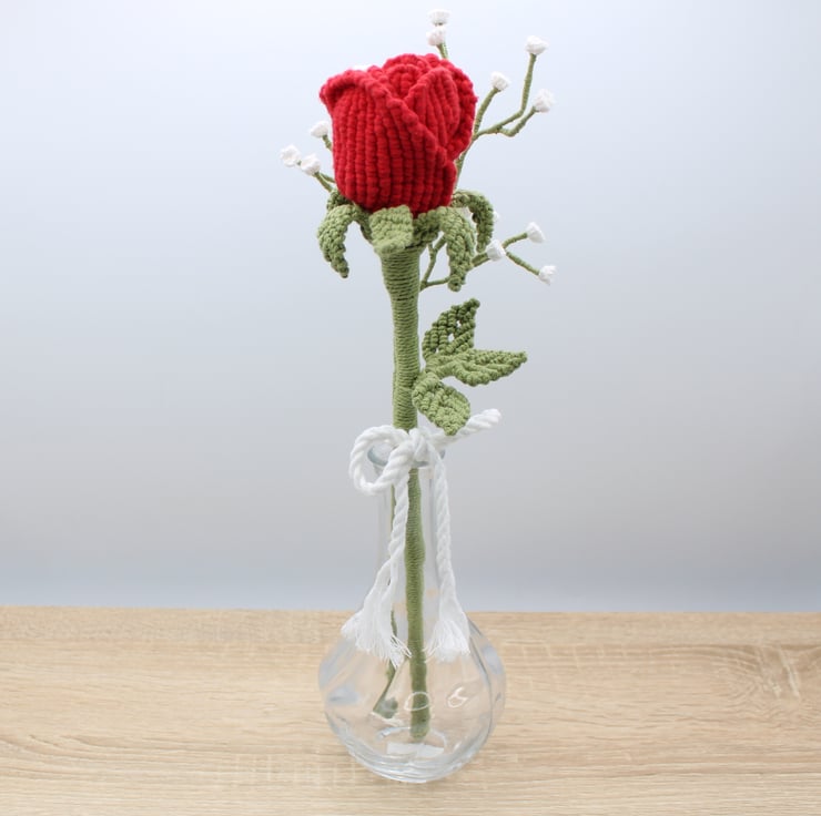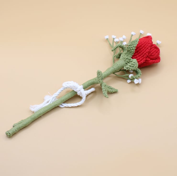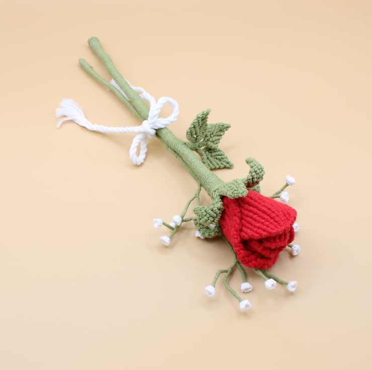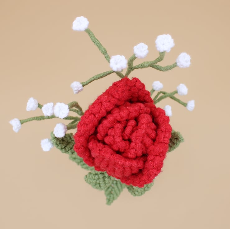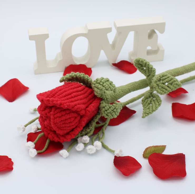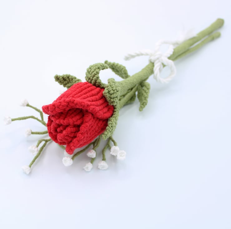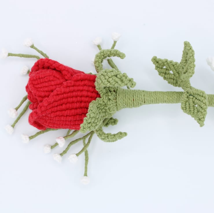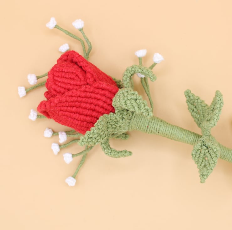 This gorgeous macrame rose has been hand crafted, each petal and leaf has been individually knotted by hand and then attached together. The rose is made from a beautiful rich red cotton cord by Bobbiny which is 100% recycled. The sepal, stem and leaves have been created in sage coloured 100% cotton bakers twine. Stub wire has been attached to the base of the three leaves and also runs through the main stem which enables the flower to be poseable.