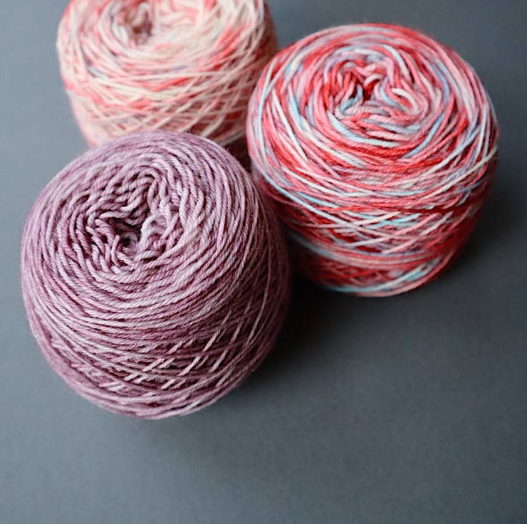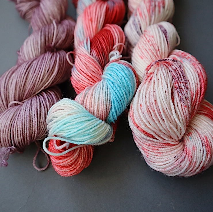 PHOTOS of dyed yarn shows possible results. Shawl shown is knitted in yarns from Rusty Ferret
