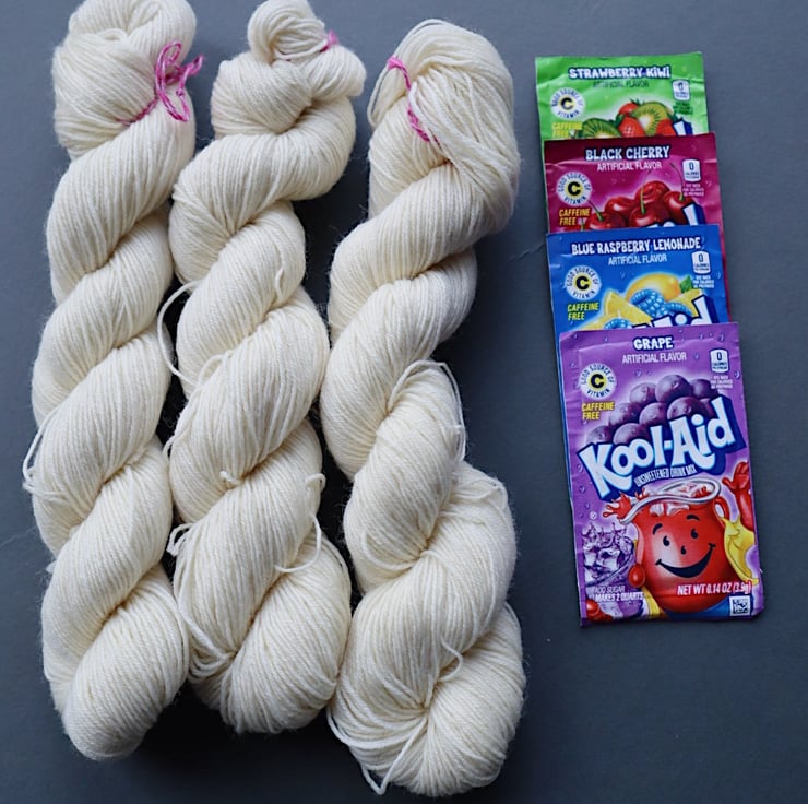 Kool-aid is a great way to dye yarns as it uses an acid dyeing technique, acid reacts with protein fibres to set the dye. But unlike other dyes, the kool-aid already contains the citric acid. Which means it's excellent for beginners or for quick dyeing.