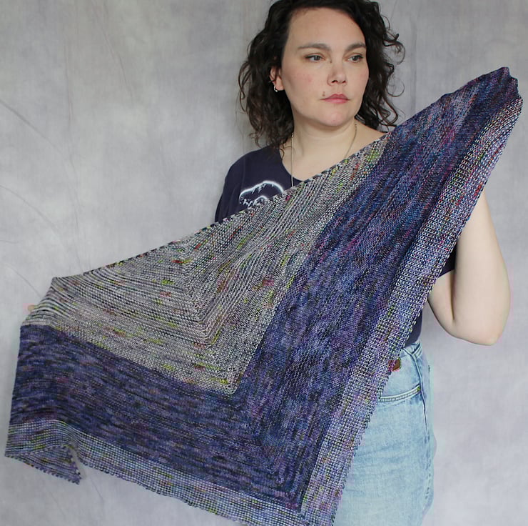 This top-down shawl is worked using a “double-pass” method, which helps to blend the colours of the yarn in single row stripes through garter stitch, stocking stitch and reverse stocking stitch sections. This technique is fully explained.