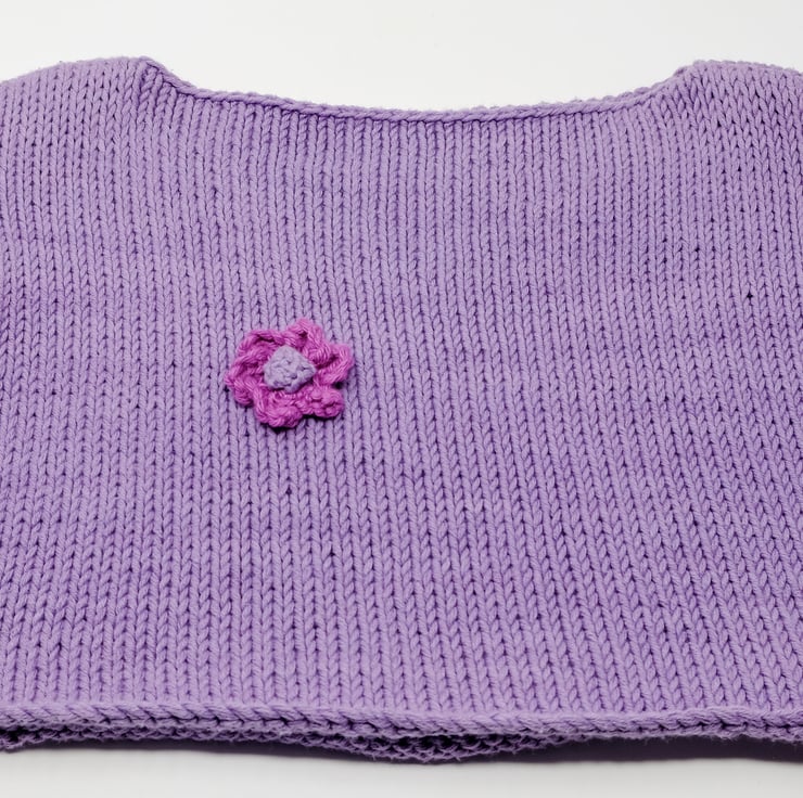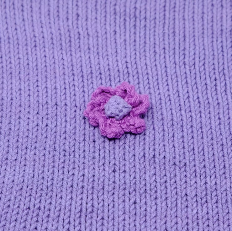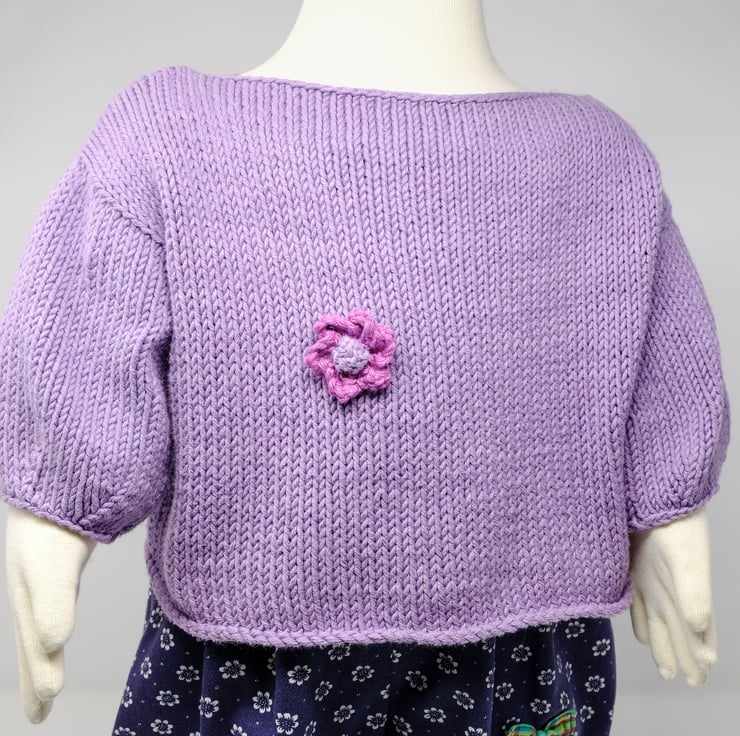 100% Organic Cotton jumper for baby. Purple with hand knitted flower on the front.