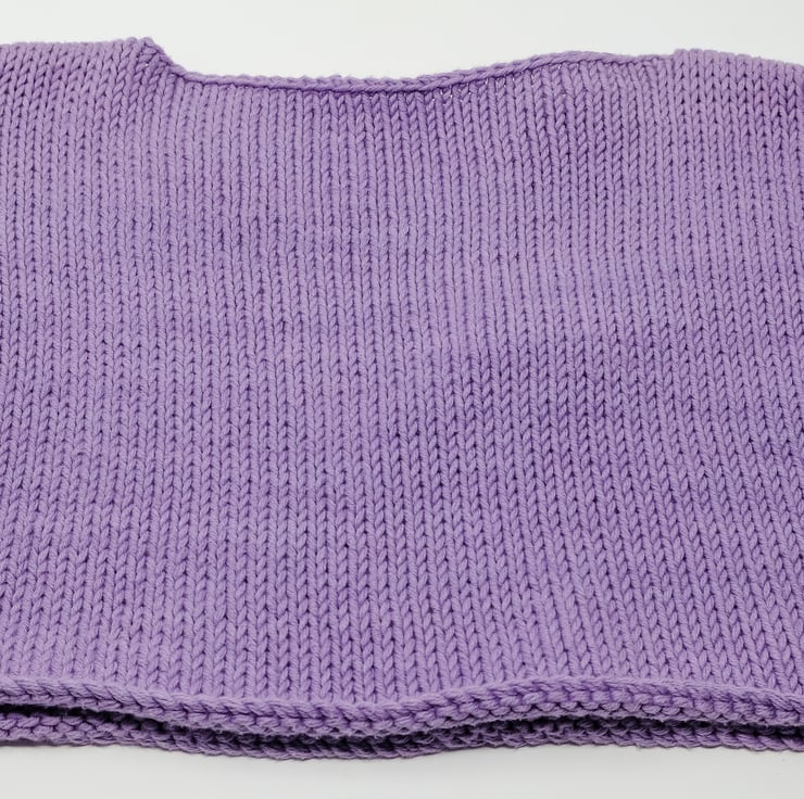 Chunky, but lightweight. It has a loose fit and is in a faded purple, eco-friendly yarn.