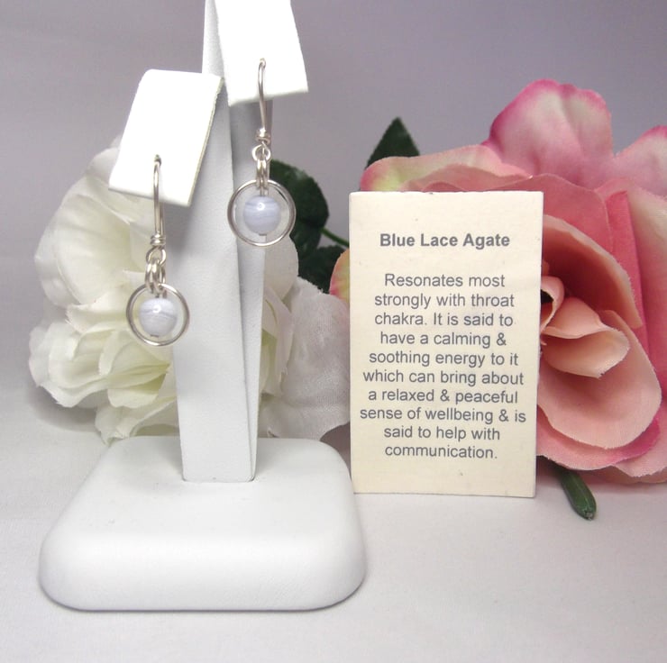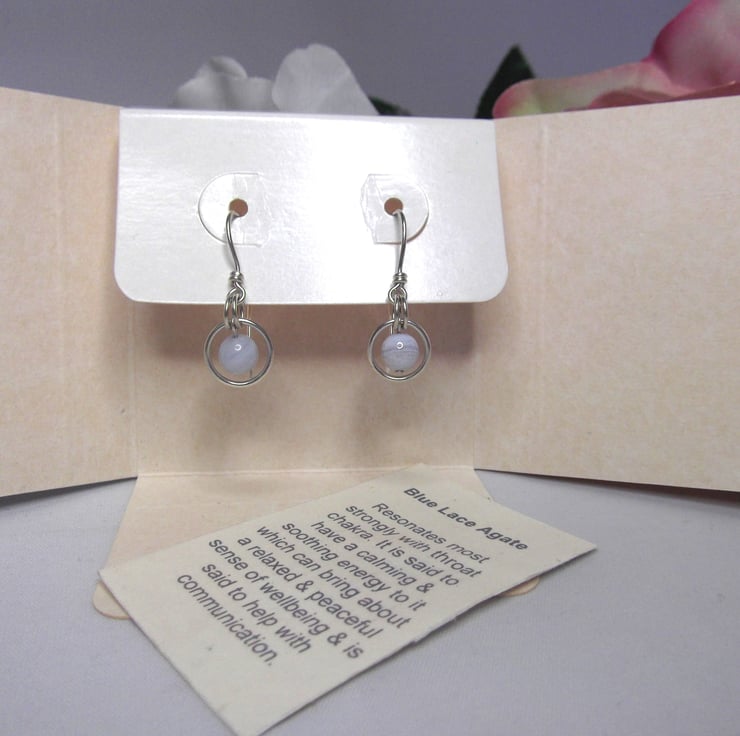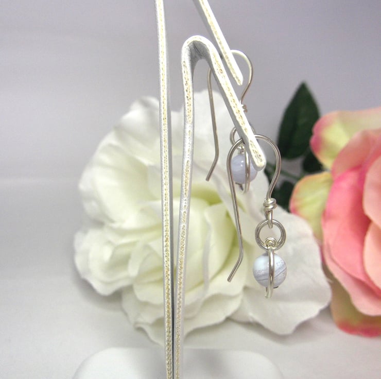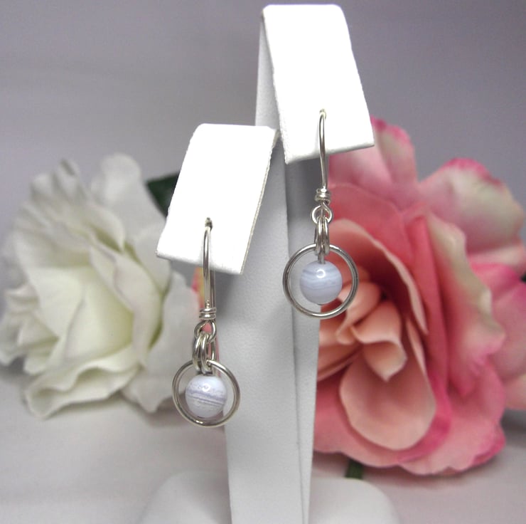 The Blue Lace Agate gemstone bead measures 6 mm in diameter & the outer silver ring 8 mm in diameter. The recycled silver handmade ear wires are designed to be comfortable and secure. The overall drop from the ear wire is approximately 12 mm.