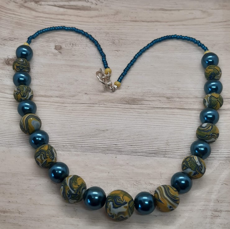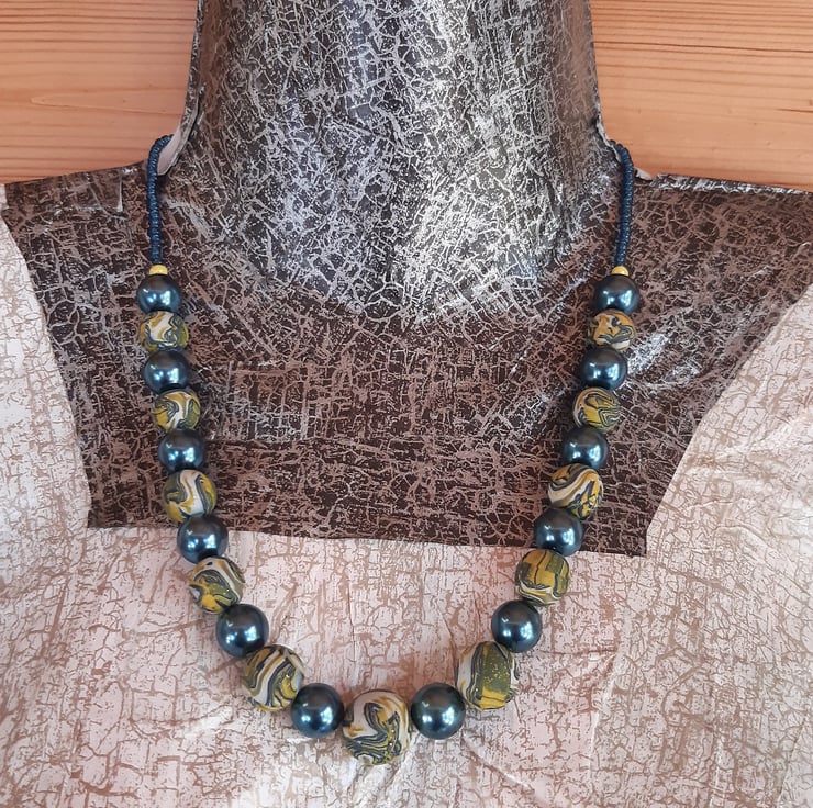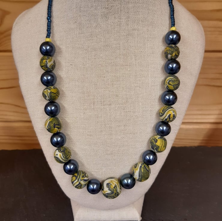 A distinctive necklace handmade from polymer clay in a navy, mustardy yellow and cream swirl pattern with a hint of sparkle.