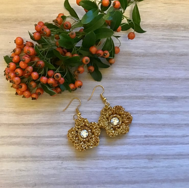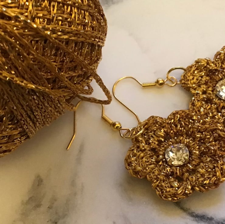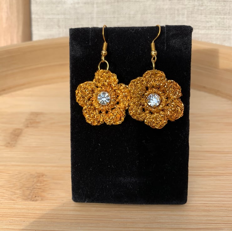 Handmade crochet earrings, gorgeous rich shimmery gold, made with luxury non tarnish metallic thread. With a Czech Crystal Montee as their centre piece, these retro style daisy/flower earrings, come complete with gold plated hooks and findings. 5cm length from top of hook to bottom of earring.