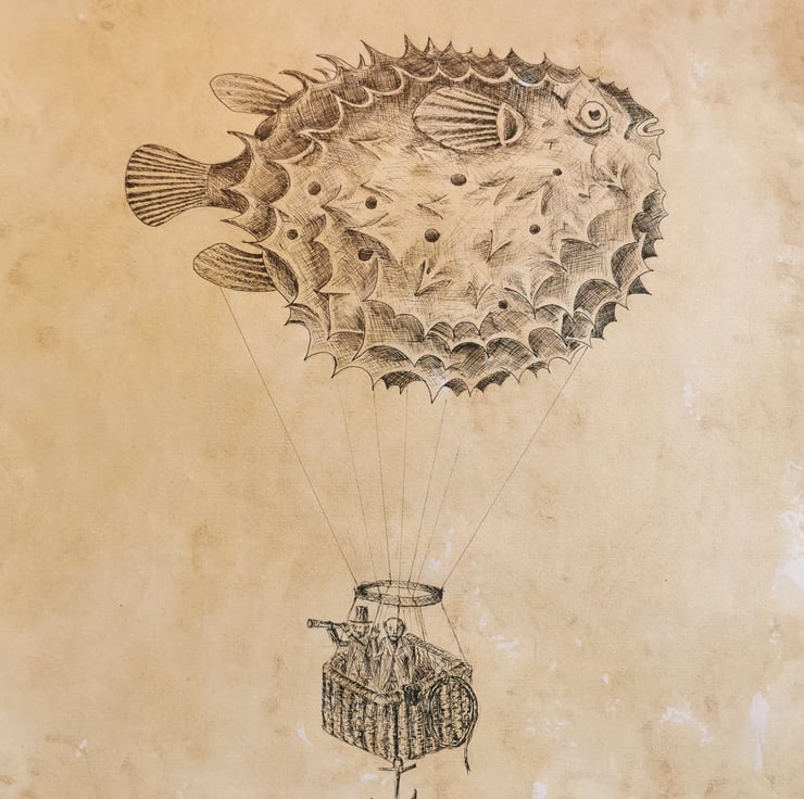 A hand drawn original artwork on painted paper. The image is a comical piece featuring a puffer fish being used as a hot air balloon.