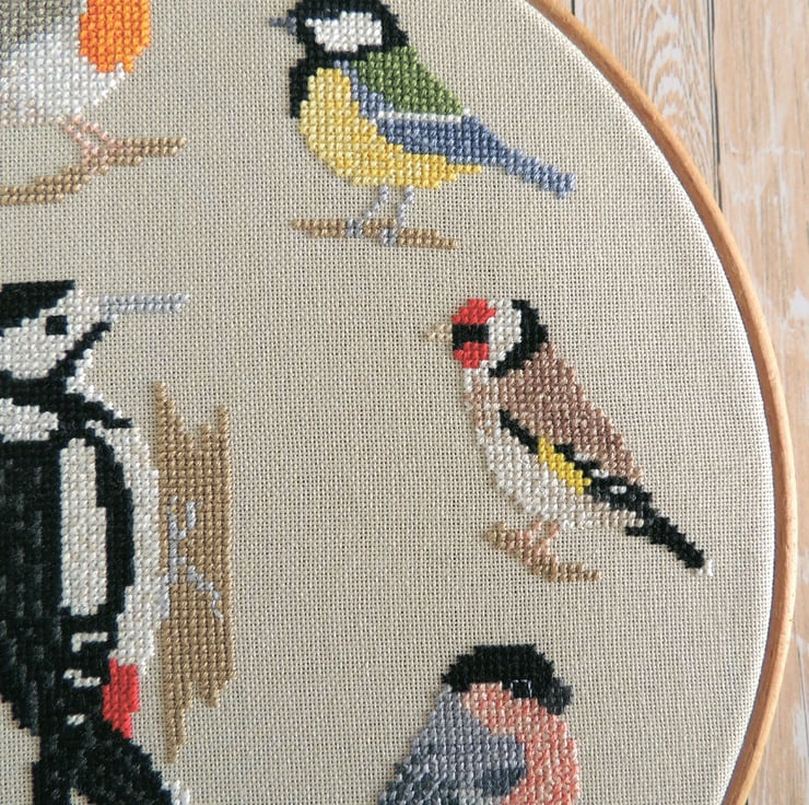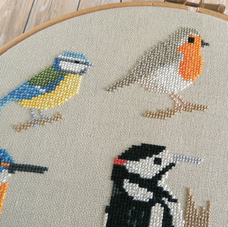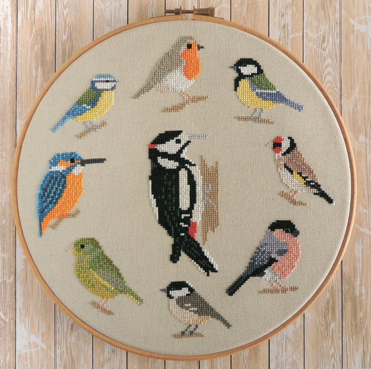 The sampler of nine birds both in colour, and black and white, plus separate patterns for blue tit, coal tit, great tit, robin, goldfinch, greenfinch, bullfinch, kingfisher and great spotted woodpecker.