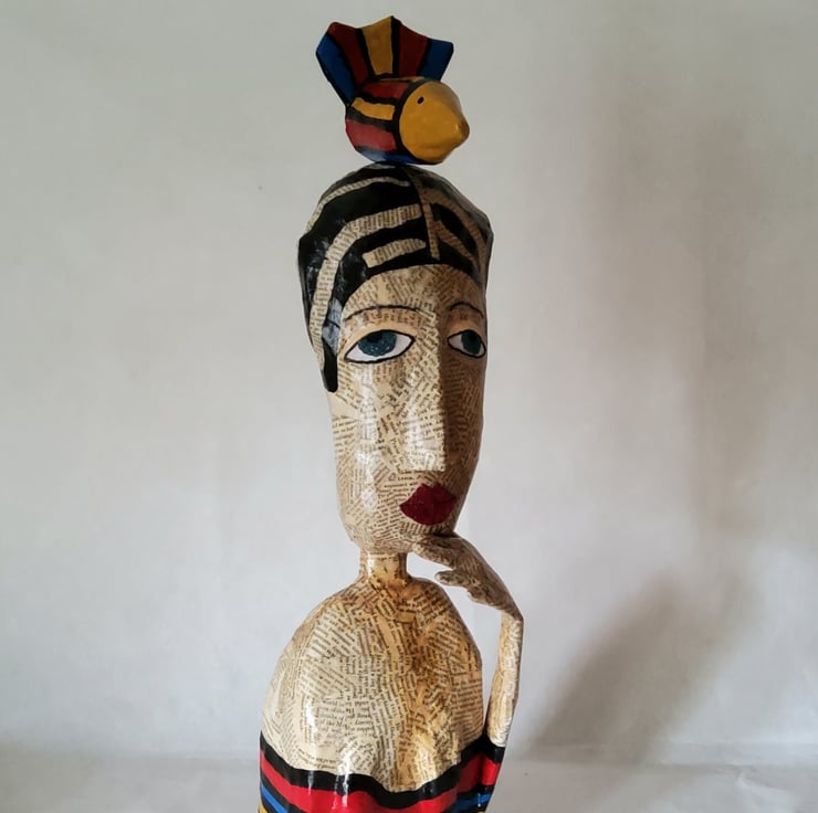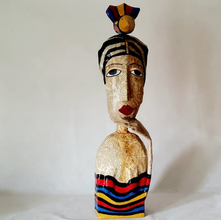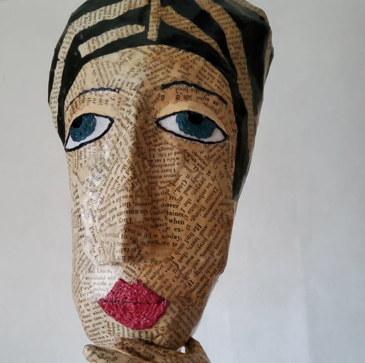 Papier mache stump doll with embroidered eyes, eyebrows and mouth.