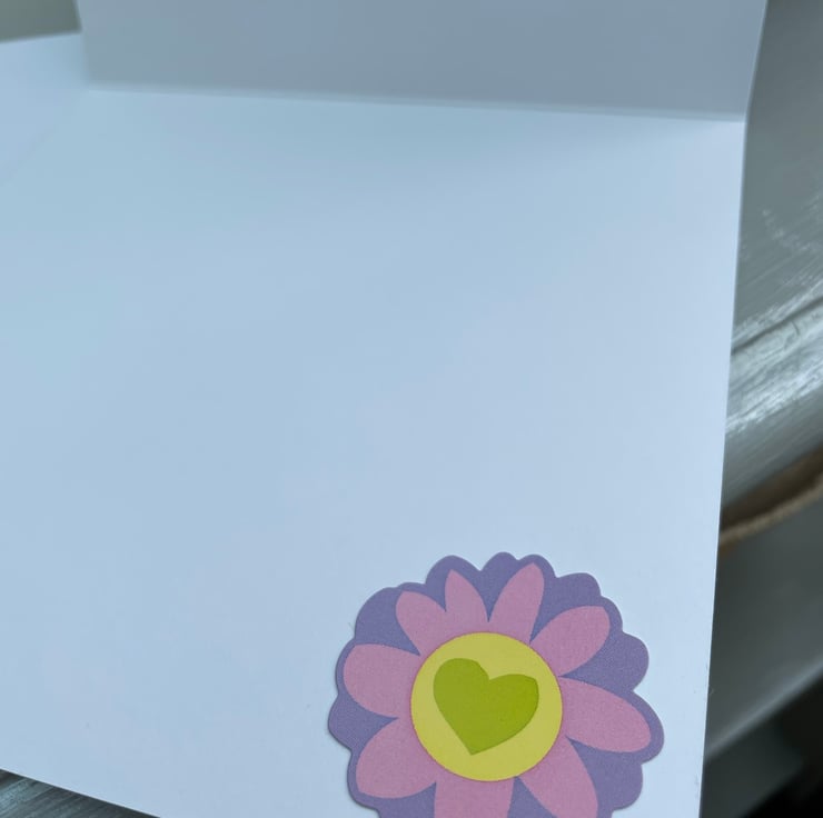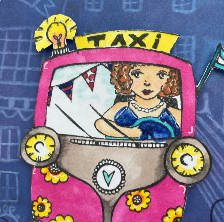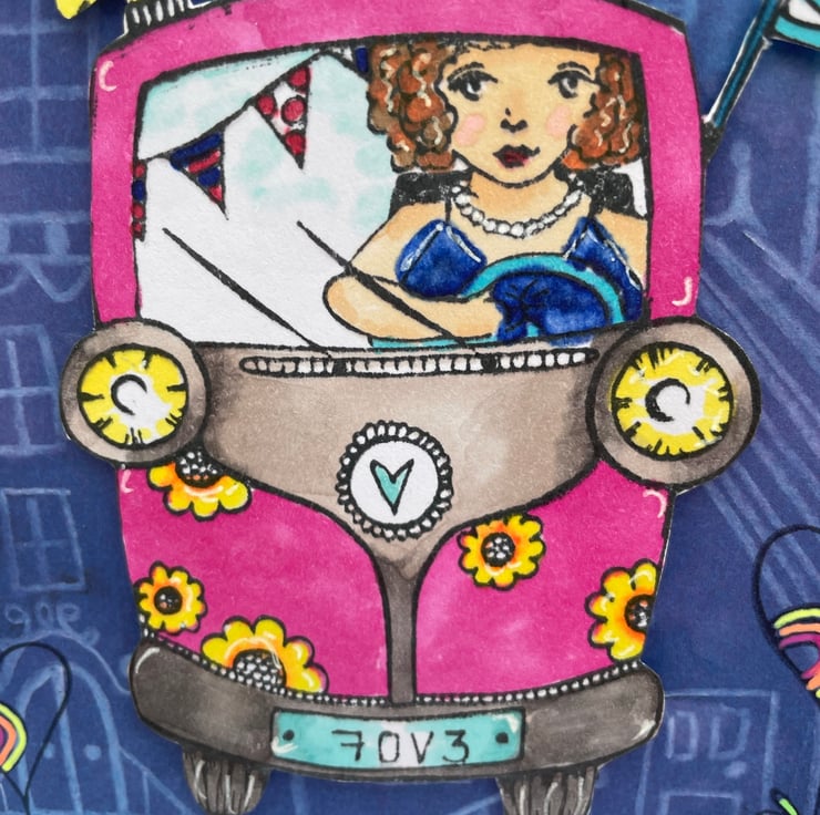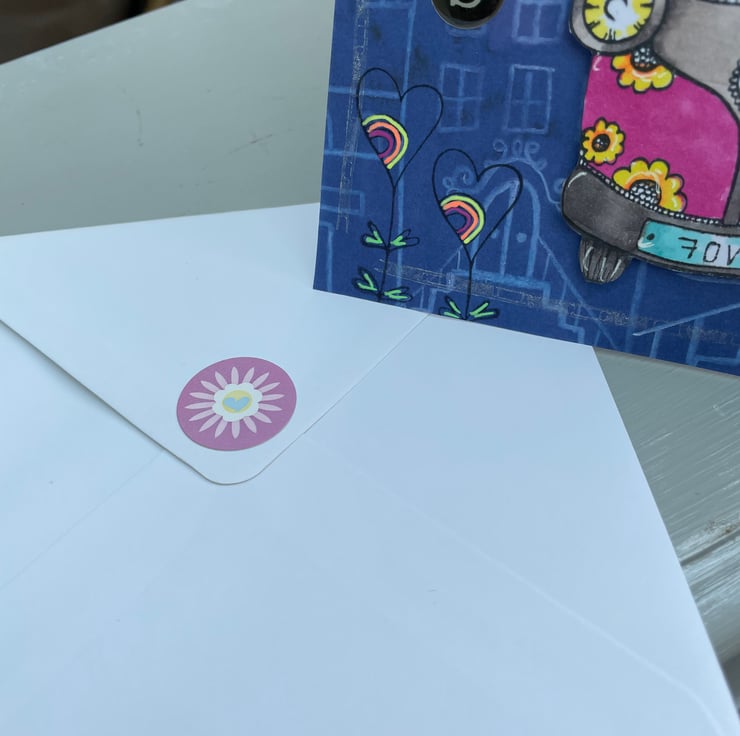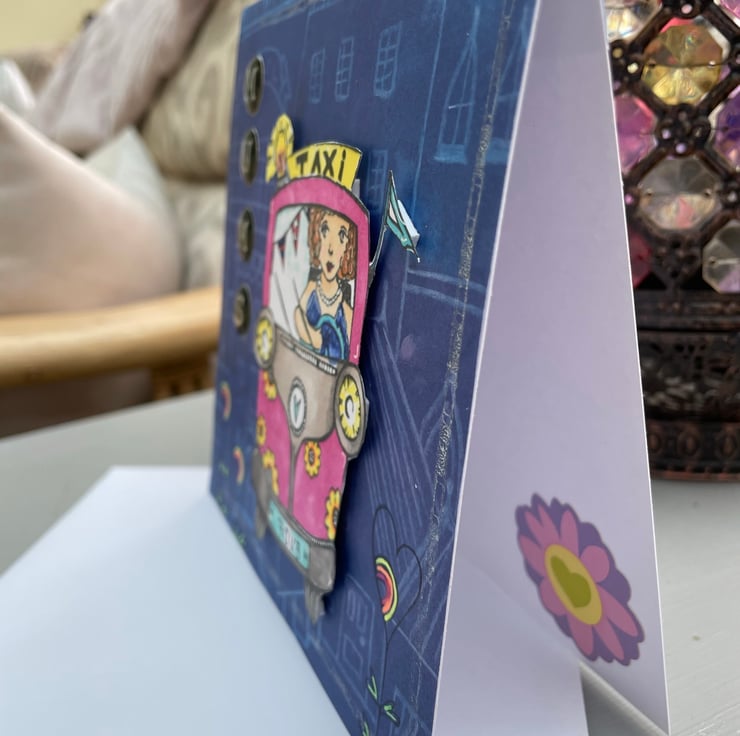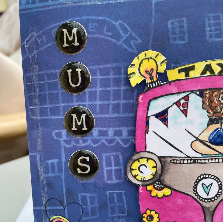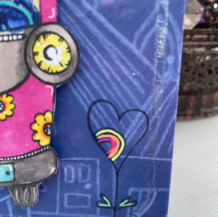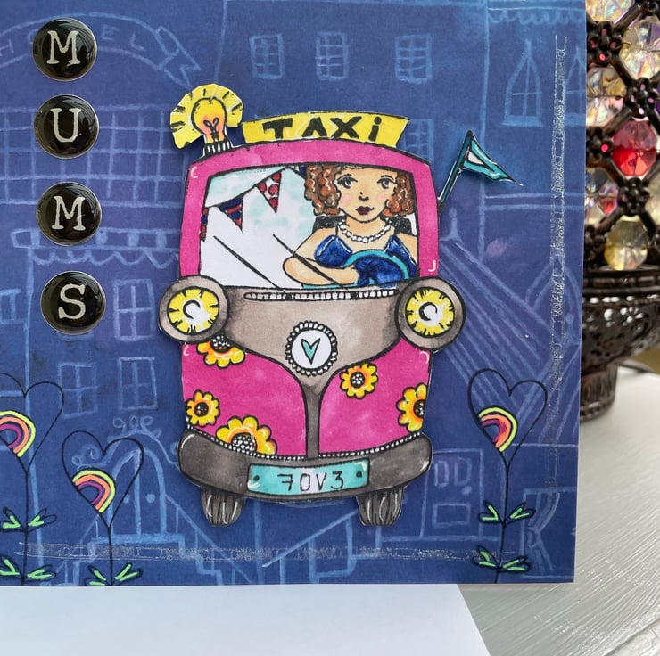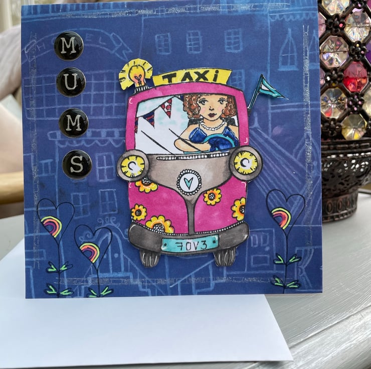 Such fun. What Mum hasn't been a taxi service? Even is that's not in a car Mum's everywhere can relate to being always on call for one thing or another! This 15x15cm card has the most adorable taxi on the front. A shocking pink VW camper decorated with flowers is the mode of transport here. Mum is inside going to pick up those children. Everything about this card is retro and fun. The background is of sketchy buildings and it is finished with fun rainbow heart flowers. This card has no greeting inside but can be used for Mother's day to say thank you for all those lifts etc etc. It could be a birthday card, a thank you card, whatever you choose. Such a different way to celebrate.