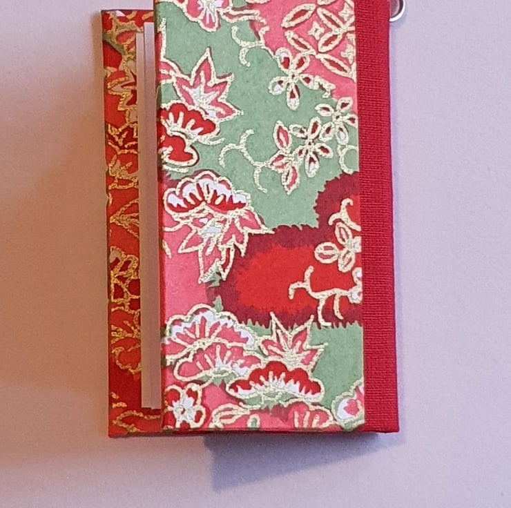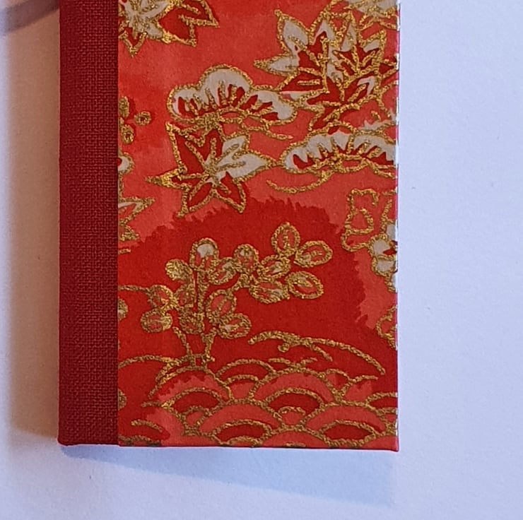 Cover is made from red bookcloth spine and Japanese Yuzen Washi paper - colourful patterns with gold metallic overlays that are silk-screened by hand (made in Japan).