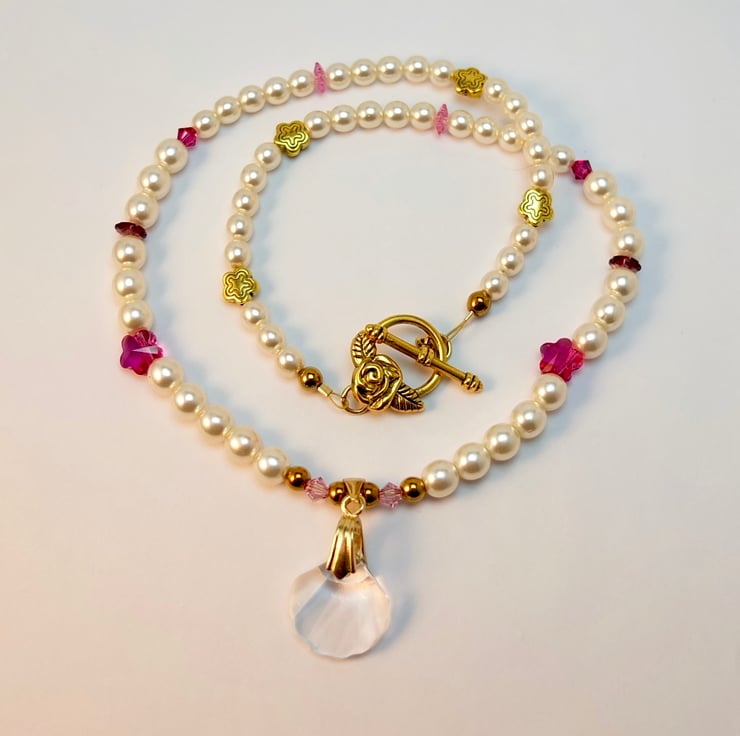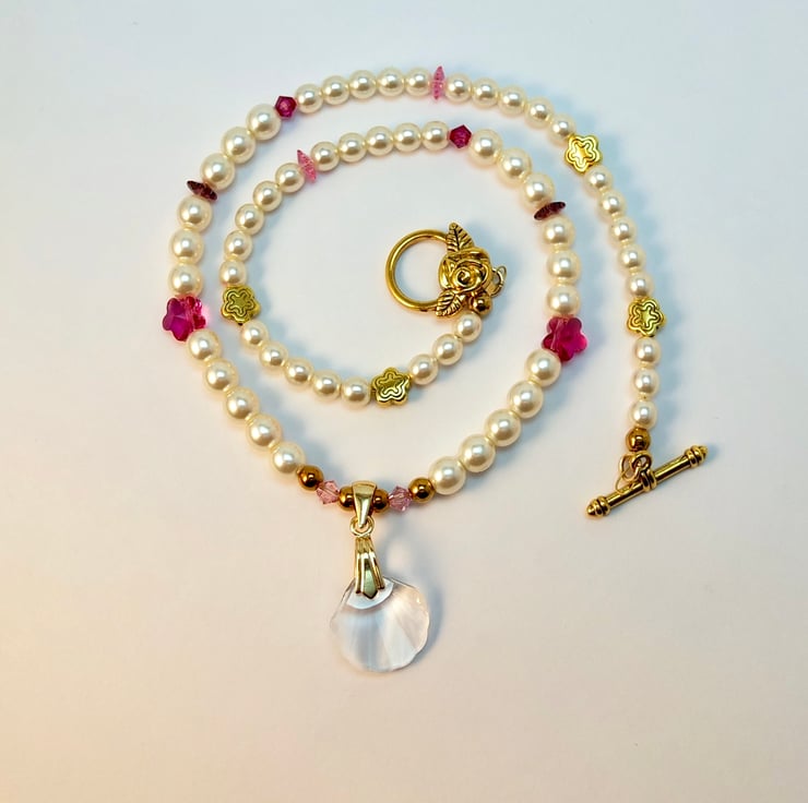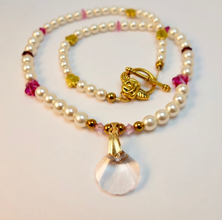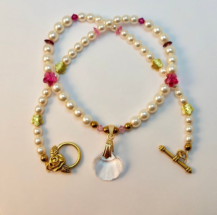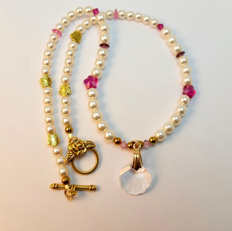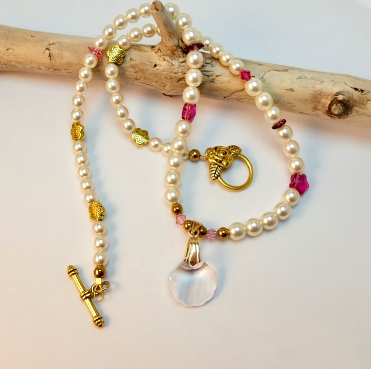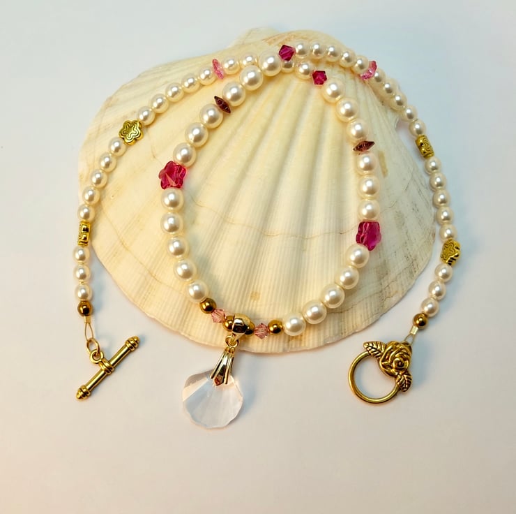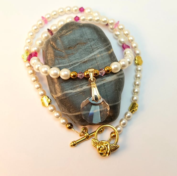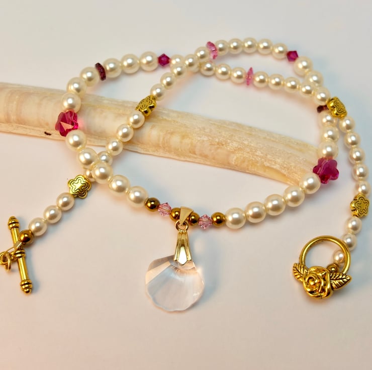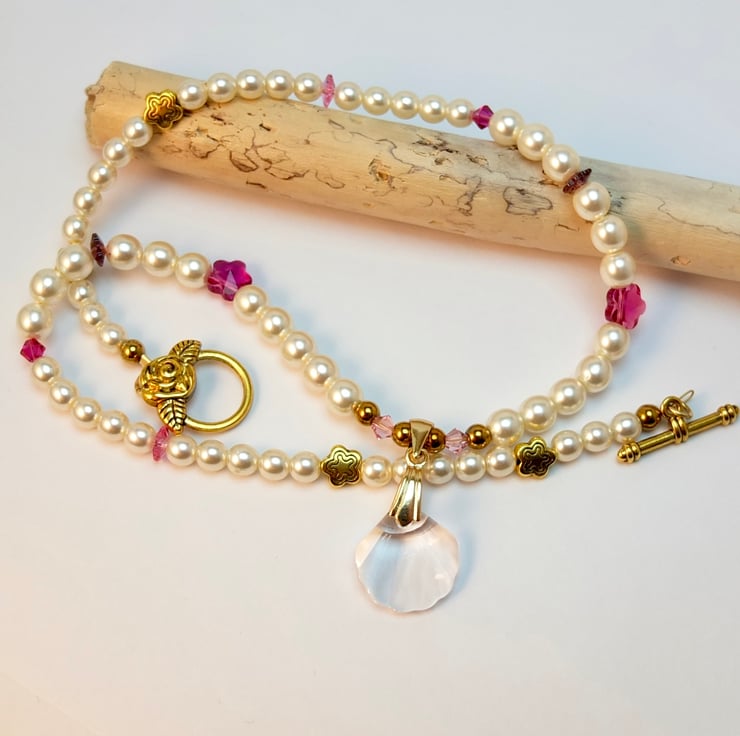As a centrepiece I have used a clear 18mm Swarovski crystal scallop shell hanging from a gold plated bail between golden hematite and a pair of "light rose" Swarovski bicones.