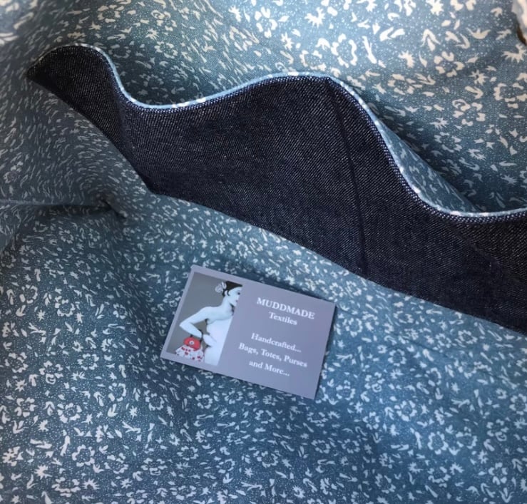 This fabulous large denim tote is matched with a gorgeous delicate floral vintage fabric by Laura Ashley of a powder blue background with off-white flowers and leaves.