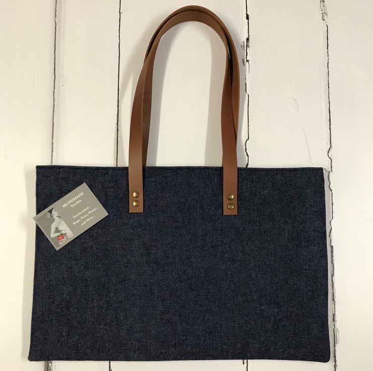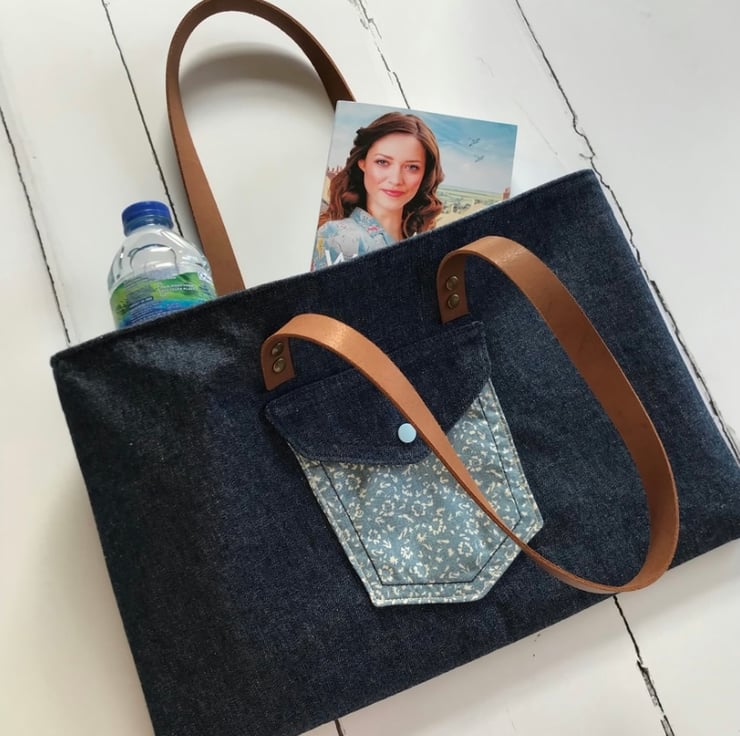 The outer bag is denim, with a handy snap fastener flap pocket made with the vintage fabric and denim on the front. The tote has bronze riveted brown leather handles, long enough to slip over your shoulder, and is lined with the same Laura Ashley floral vintage fabric and completed with a double slip pocket on one side in denim.