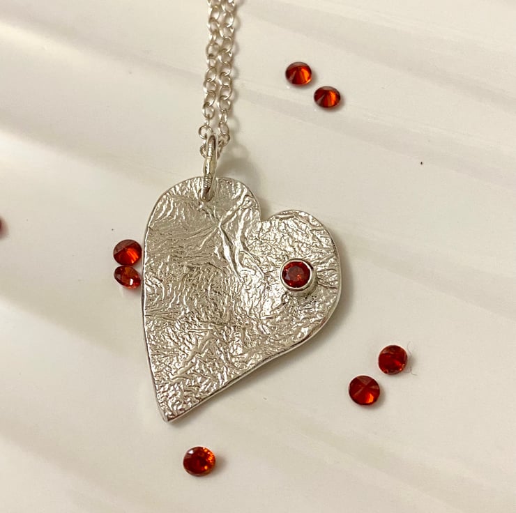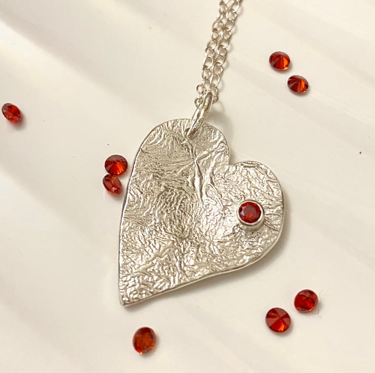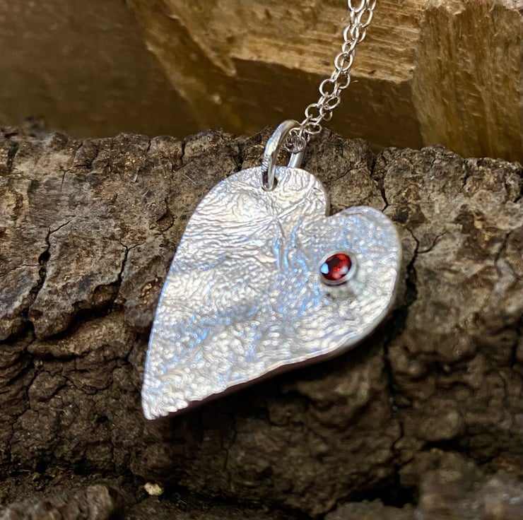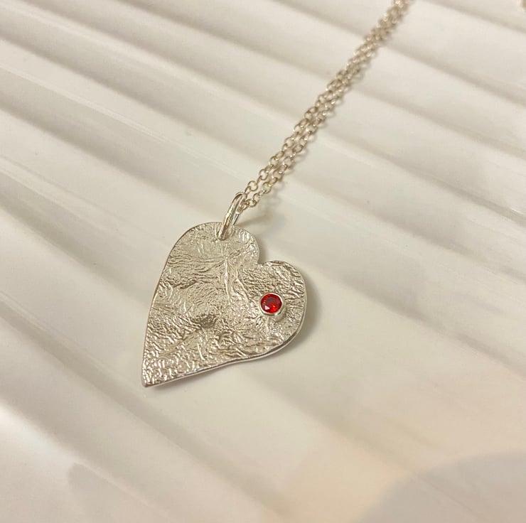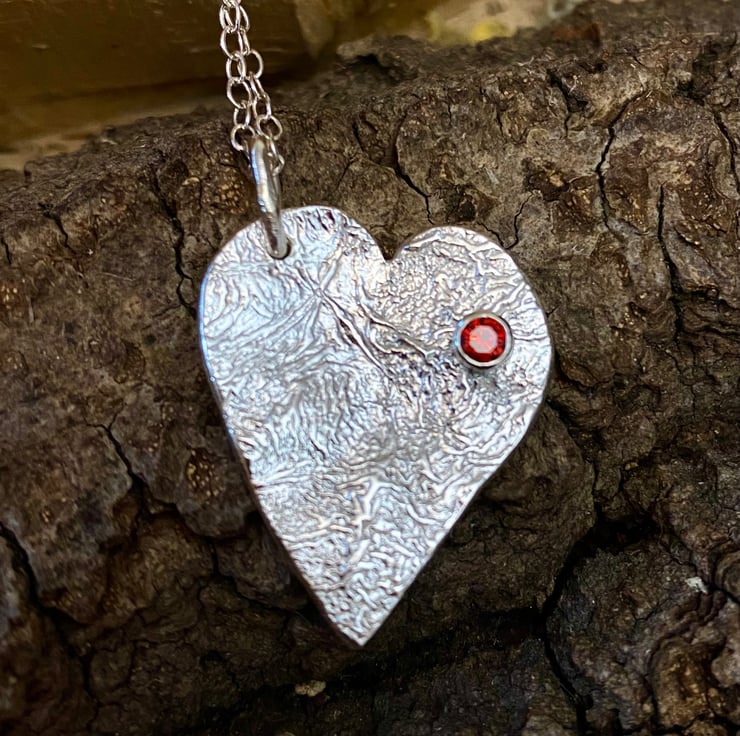 A pretty little heart necklace with red facetedstone set onto textured detail. Light & pretty