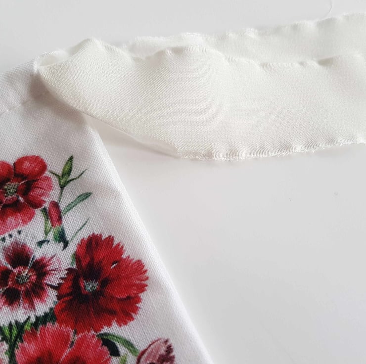- Tied with 1” ivory silk ribbon with raw edges (light fraying)