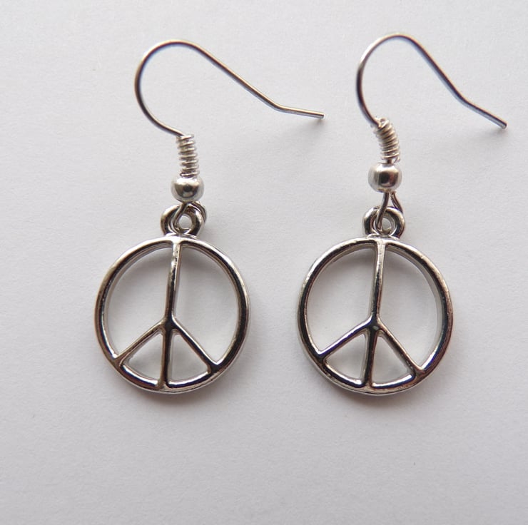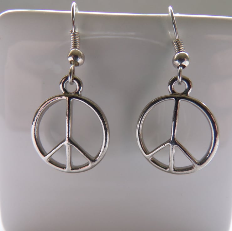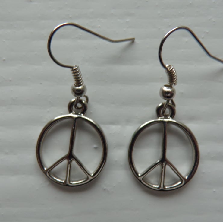 Peace Earrings. The symbol designed for the British nuclear disarmament movement in 1958 is now widely known as the "peace sign". These pretty silver coloured earrings measure approximately 1.5cm in diameter. The earwires are hypoallergenic silver-plated, perfect for sensitive ears.