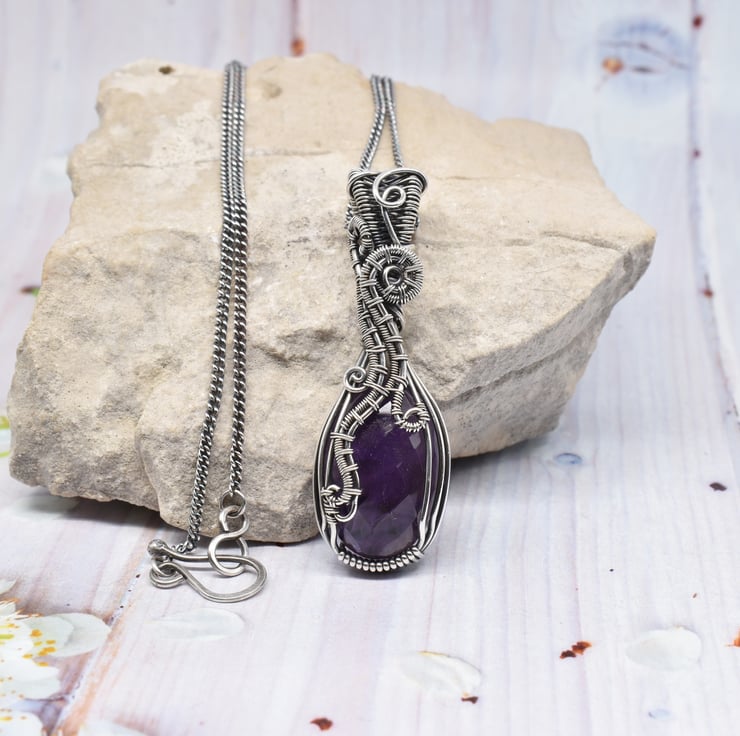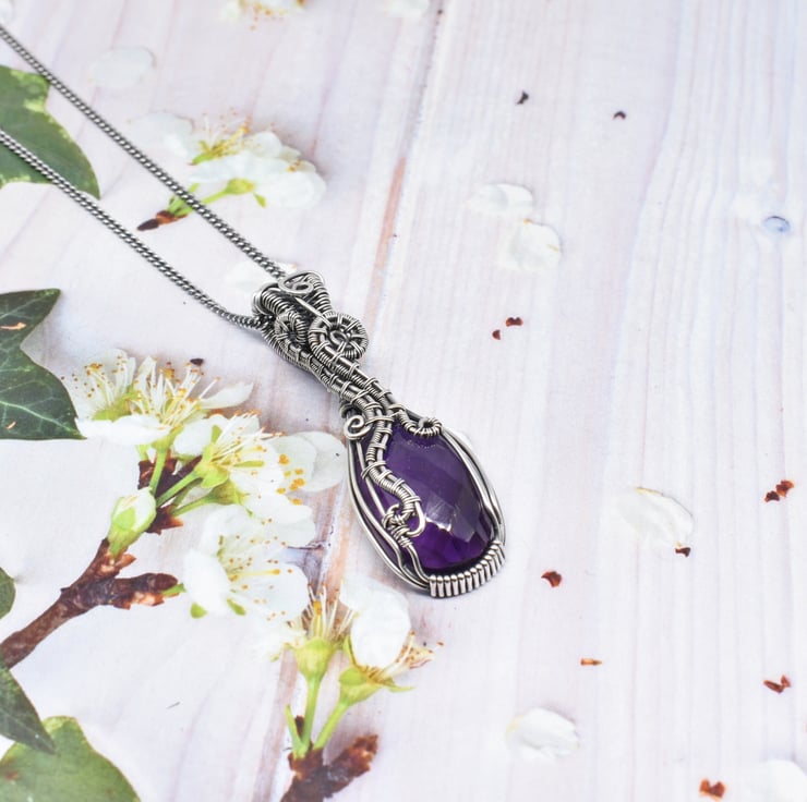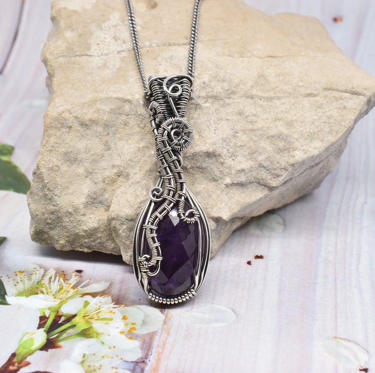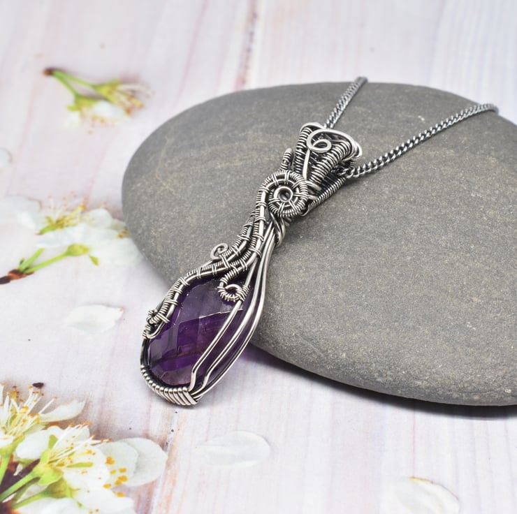 I have wire wrapped around this stunning faceted amethyst using sterling and fine silver wire to make this lovely pendant.