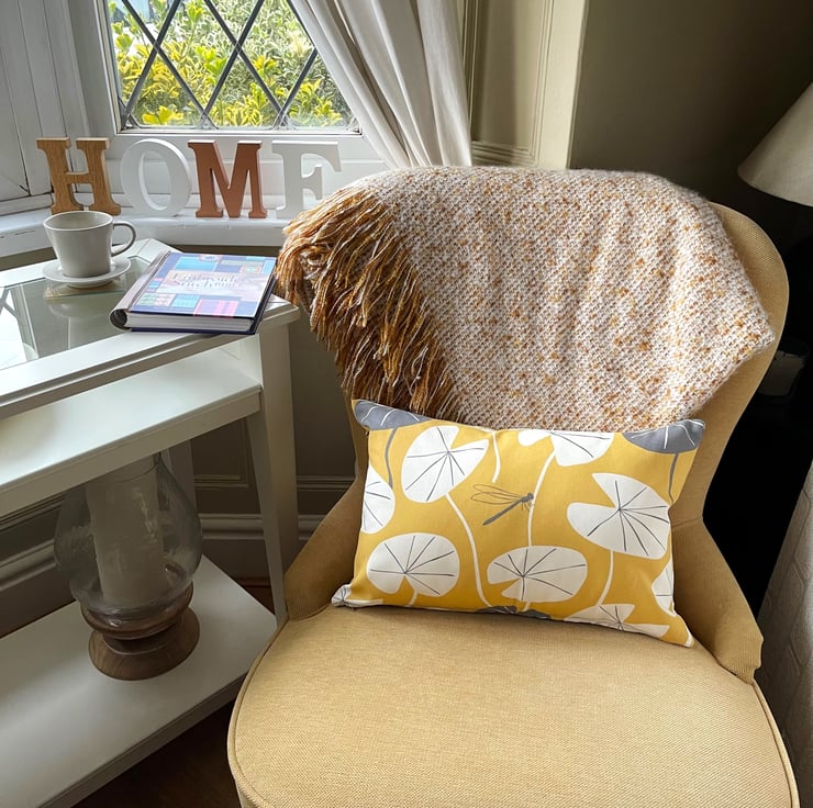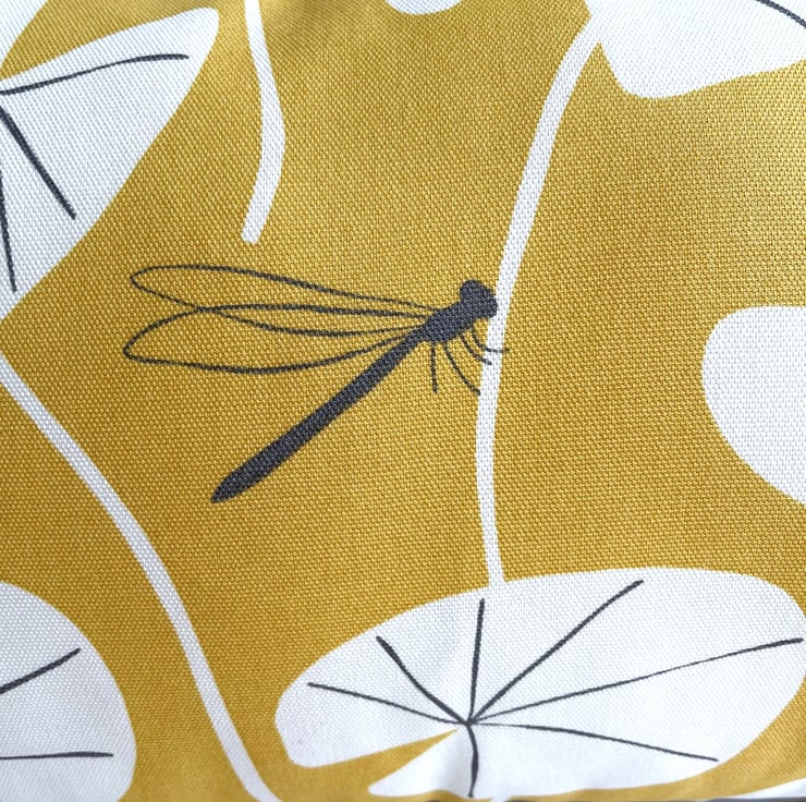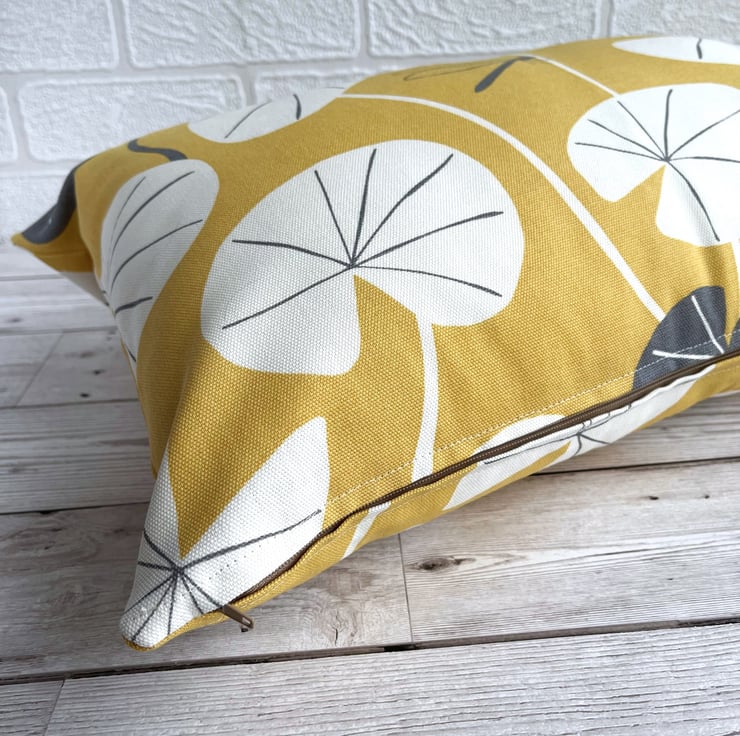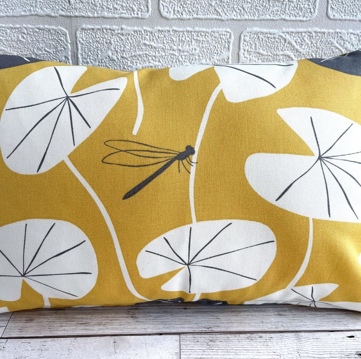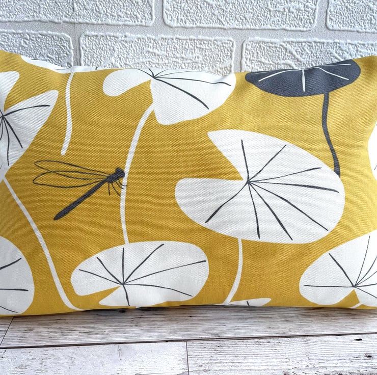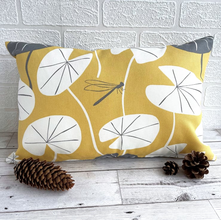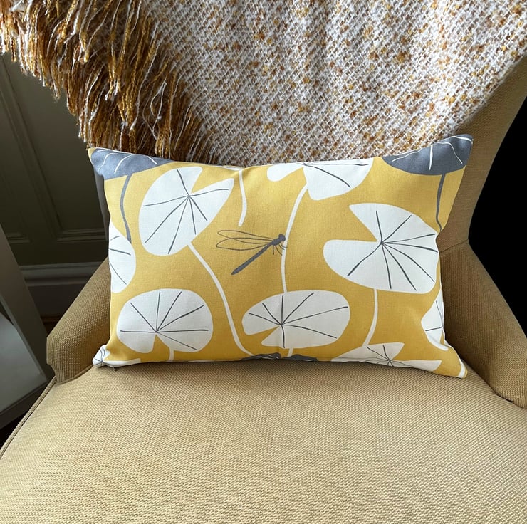 Golden yellow cushion with lily pad leaves and dragonfly. A rectangular cushion in lovely bright golden yellow fabric featuring a water lily leaf print pattern. The pattern shows stylised white lily pad leaves, with the occasional grey leaf, and a single small grey dragonfly. The design is similar on the back. The cover has a concealed zip along the bottom and comes with a polyester hollow fibre cushion pad which conforms to safety regulations.