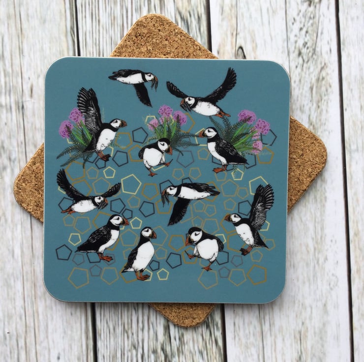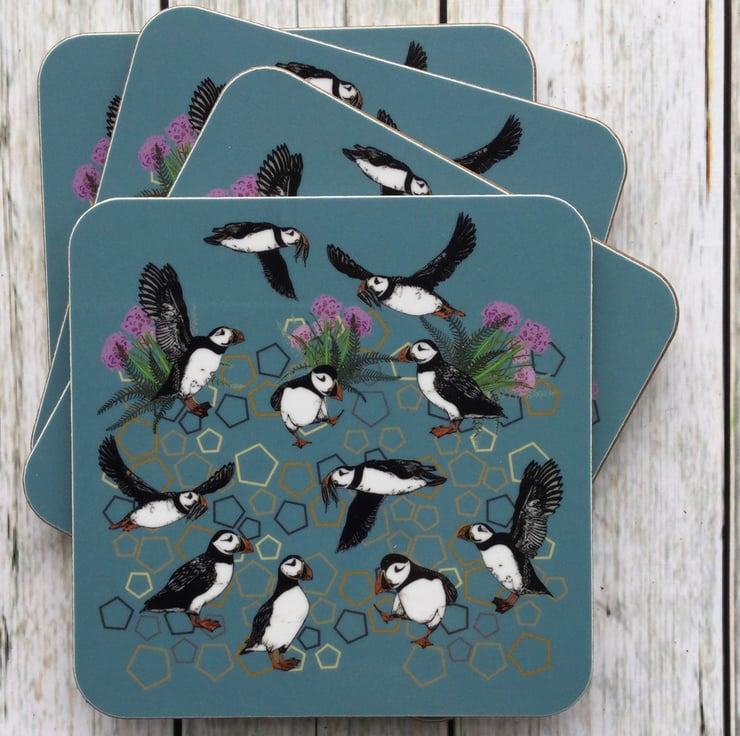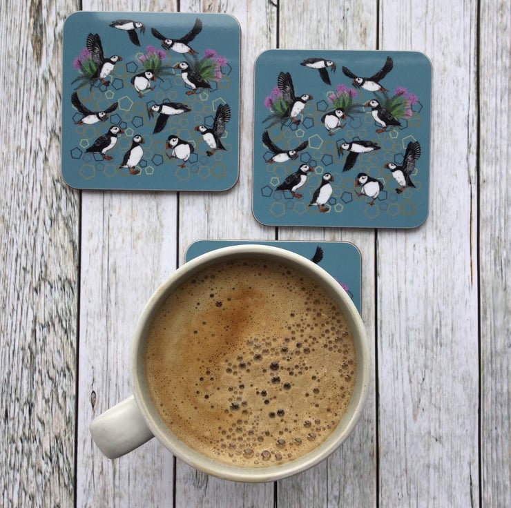 This Circus of Puffins Coaster is available individually or as a set. All my designs are brightly coloured and inspired by the beautiful Scottish wildlife.