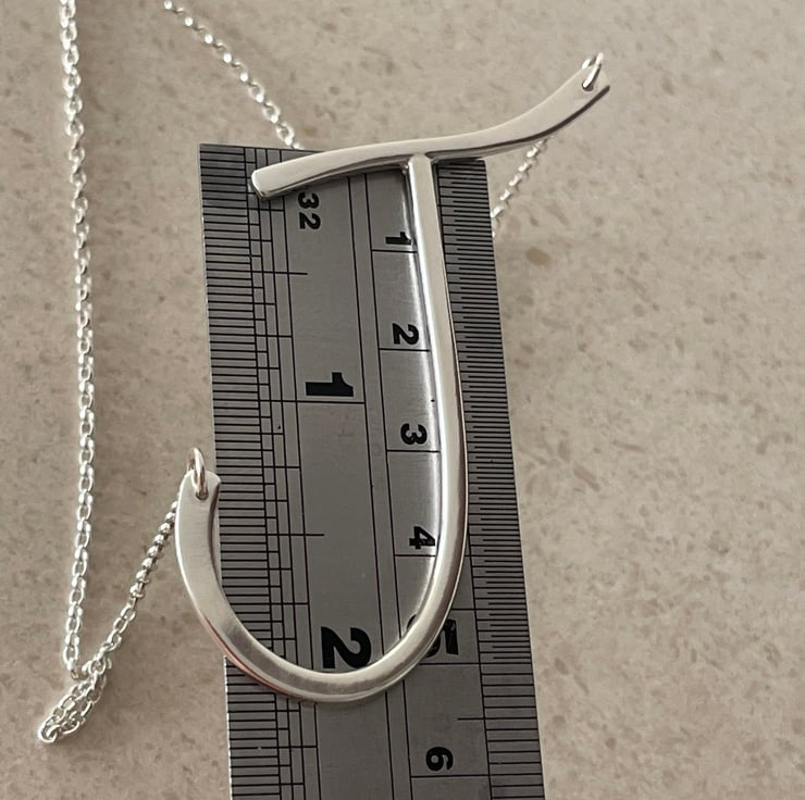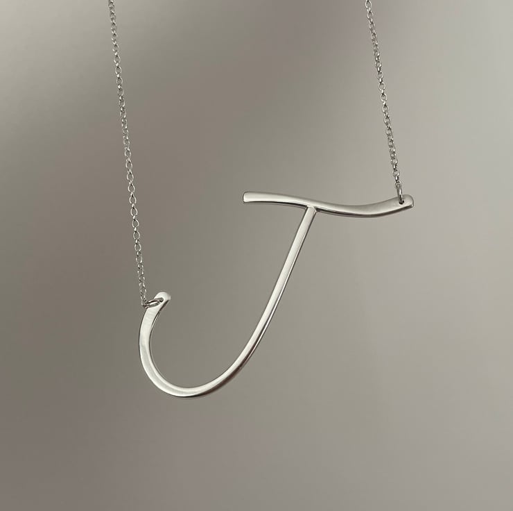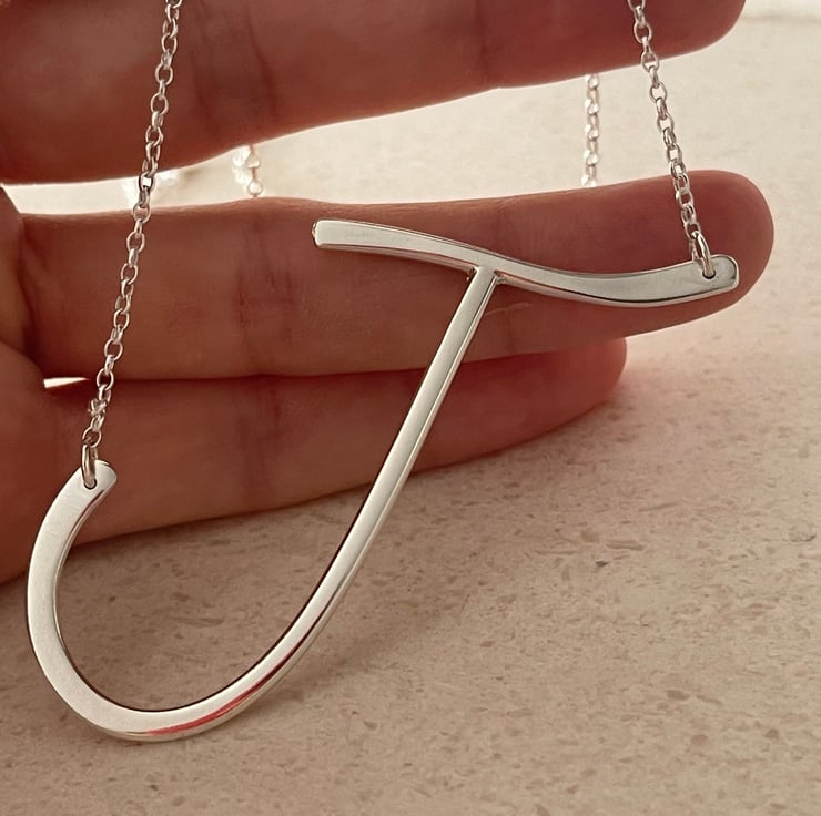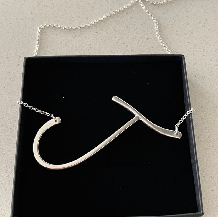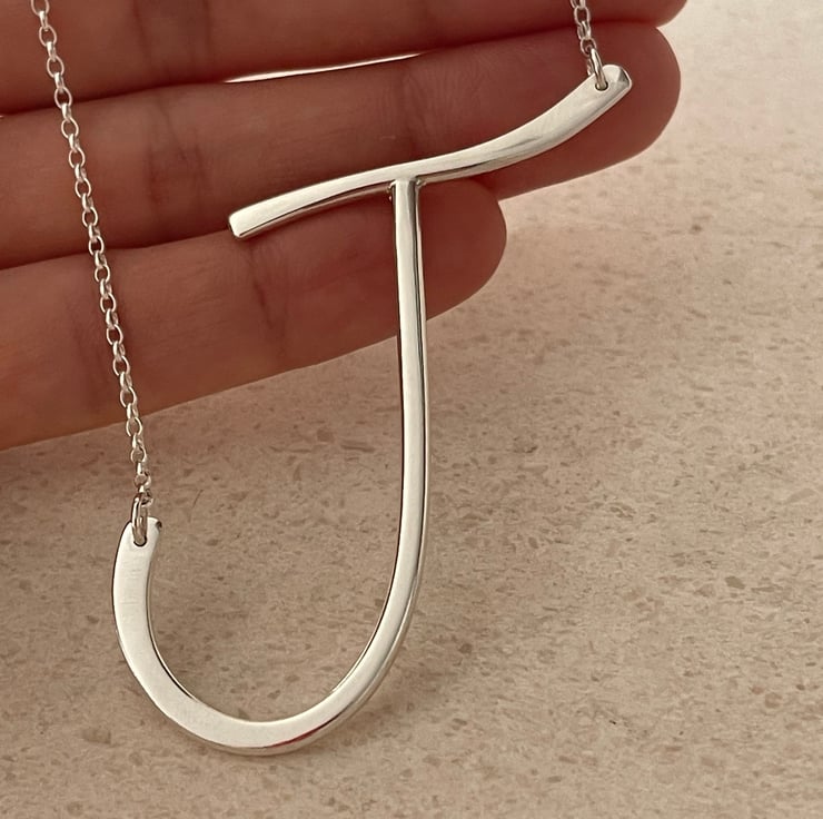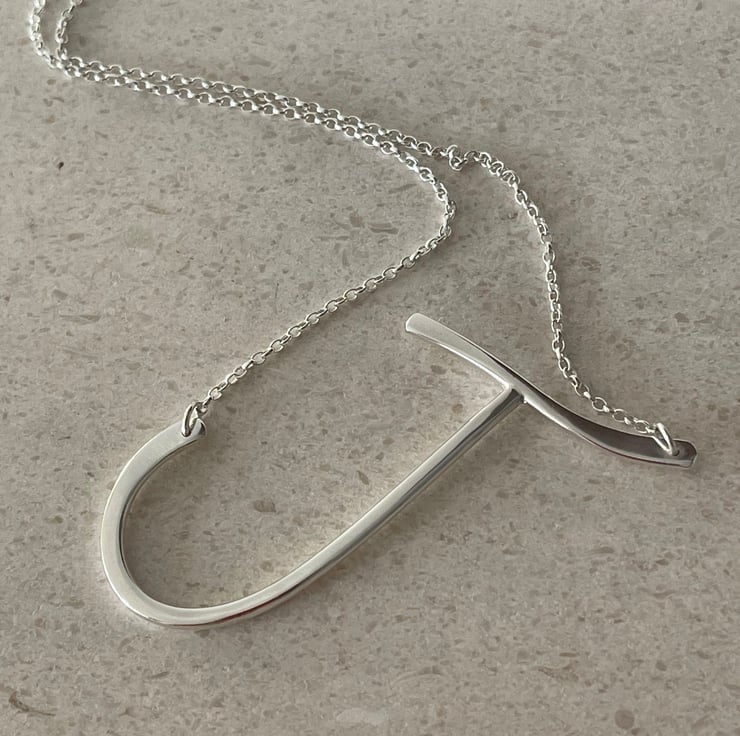 A trendy, stylish, handmade letter J necklace, in a large size, made from solid sterling silver.