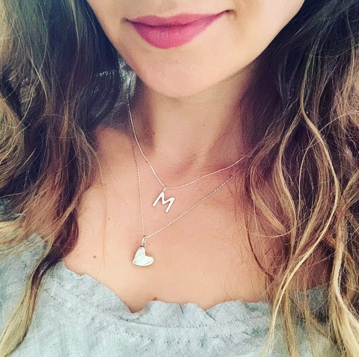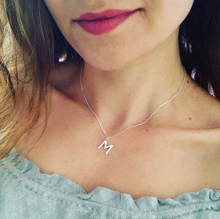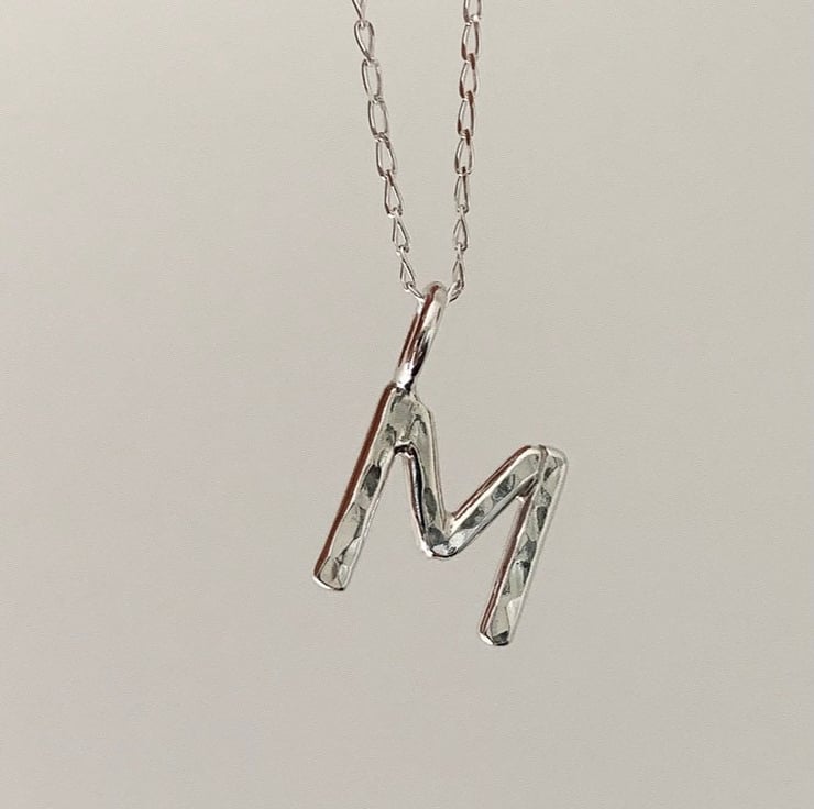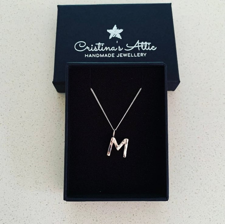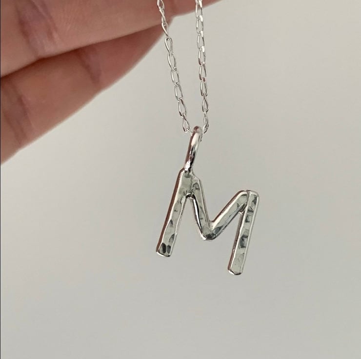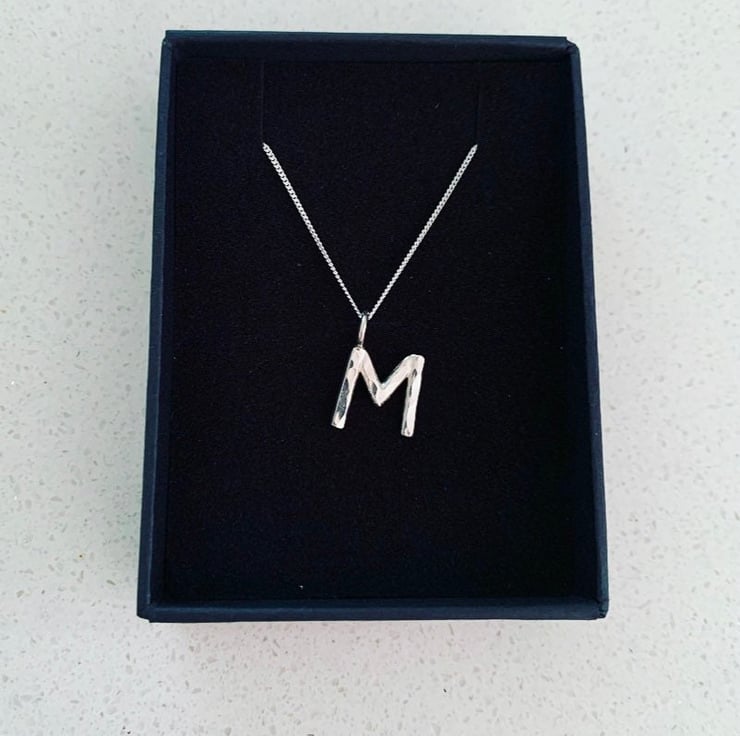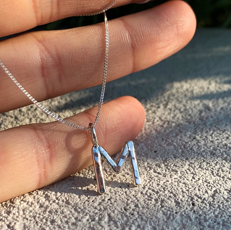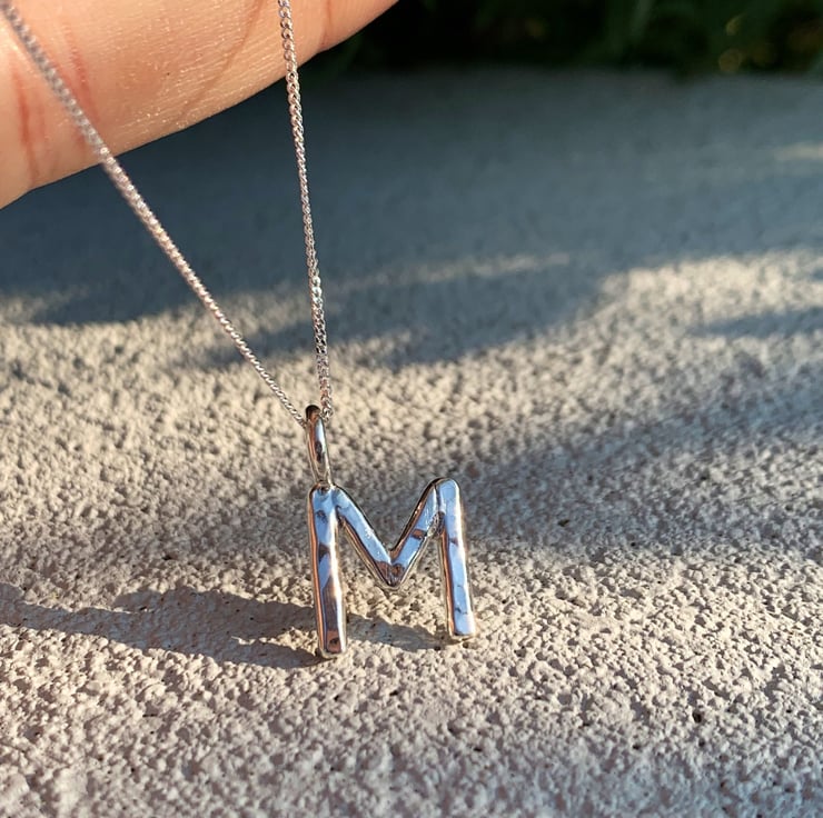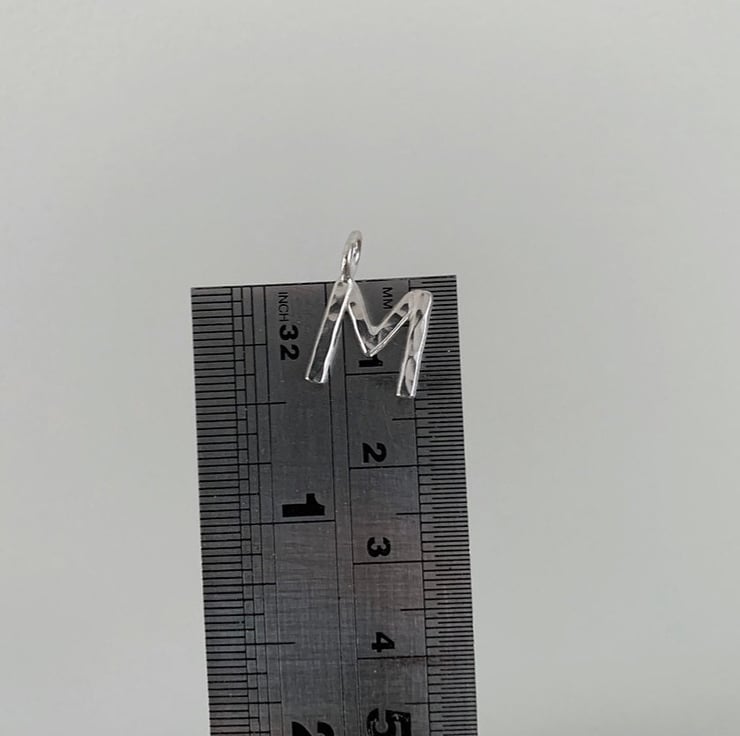 The M is made from 2mm thick solid silver and measures just over 1cm in height not including the little ring connector.