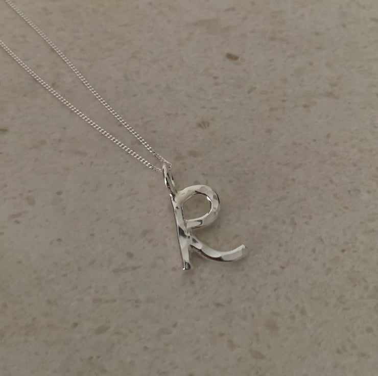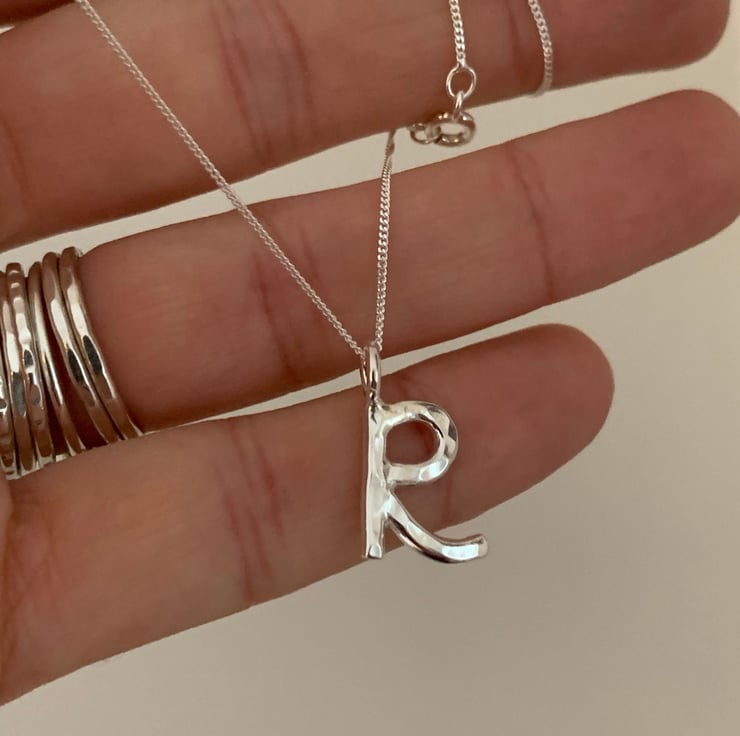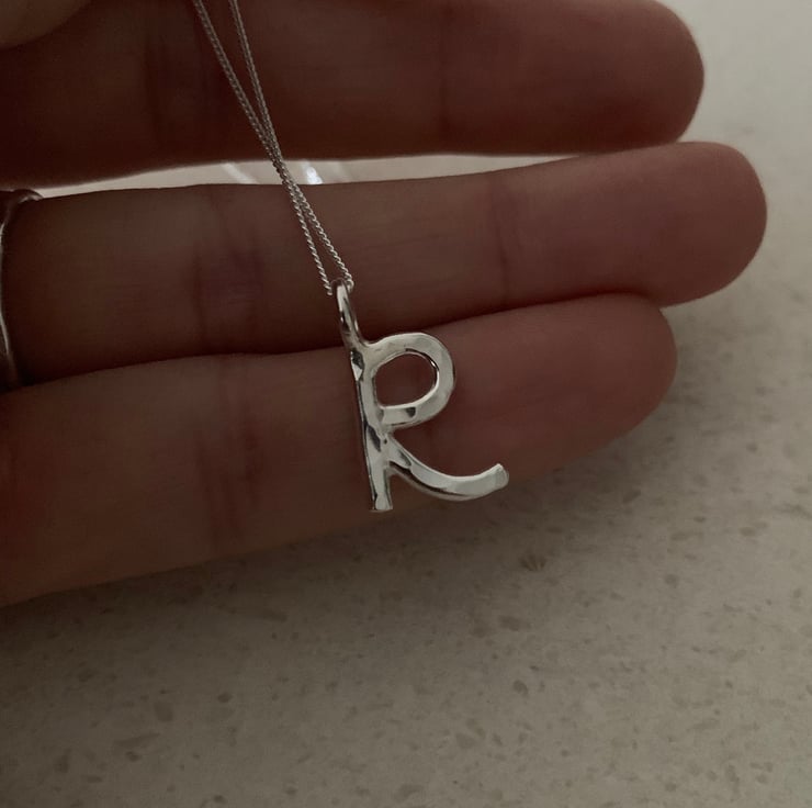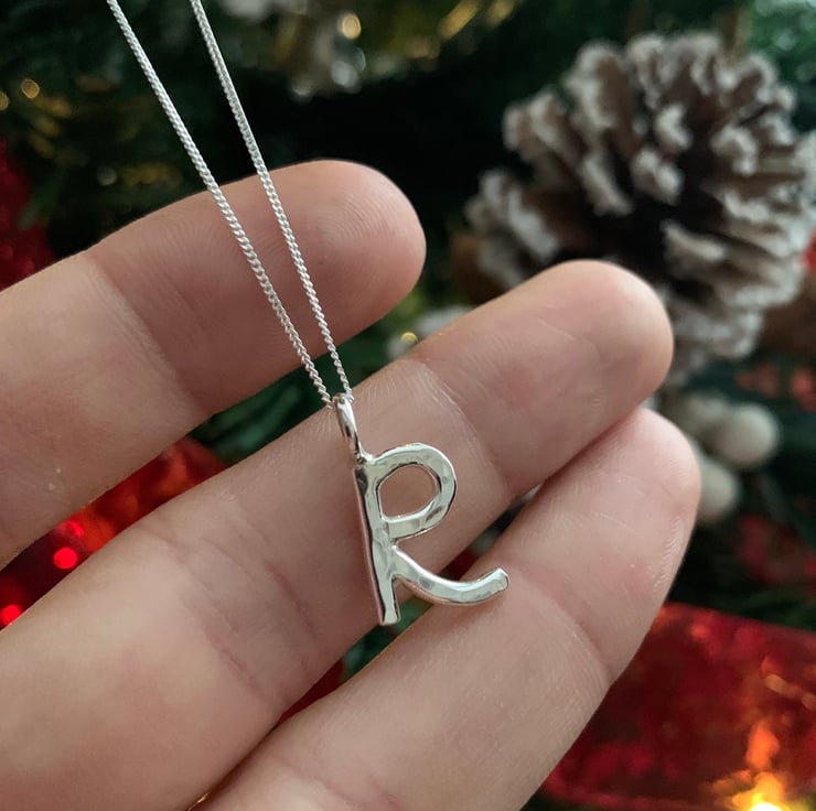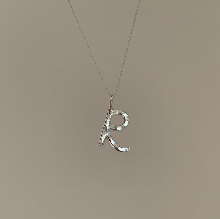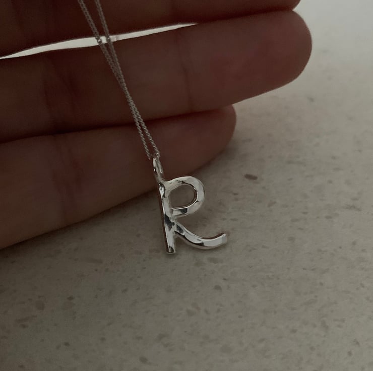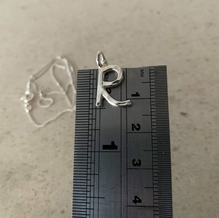 The R is made from 2mm thick solid silver and measures approximately 1cm in height not including the little ring connector.
