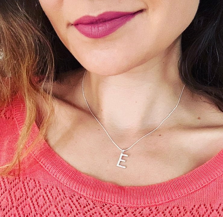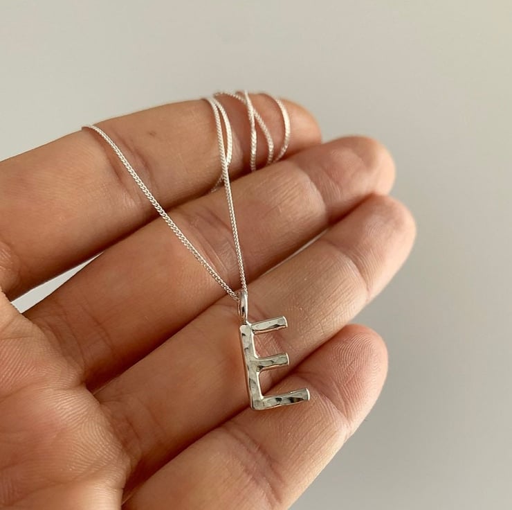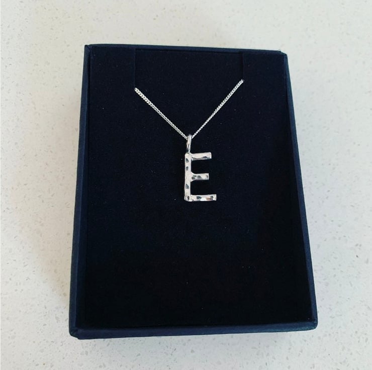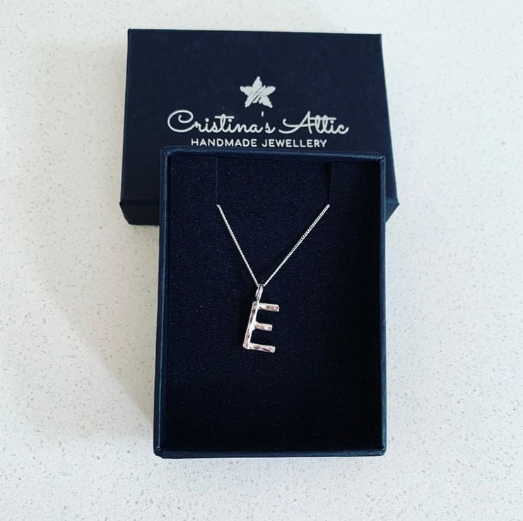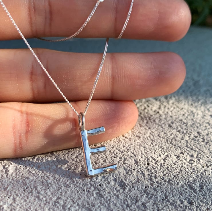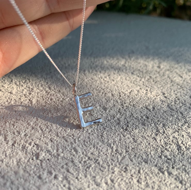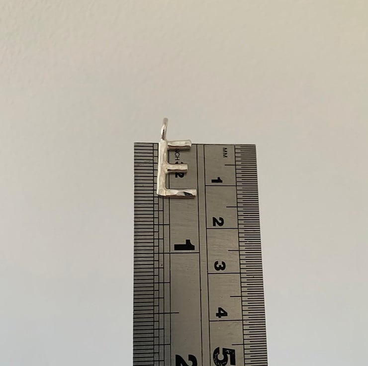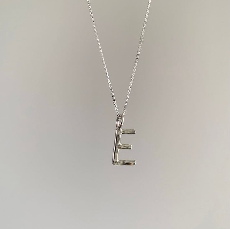 The E is made from 2mm thick solid silver and measures approximately 1cm in height not including the little ring connector.