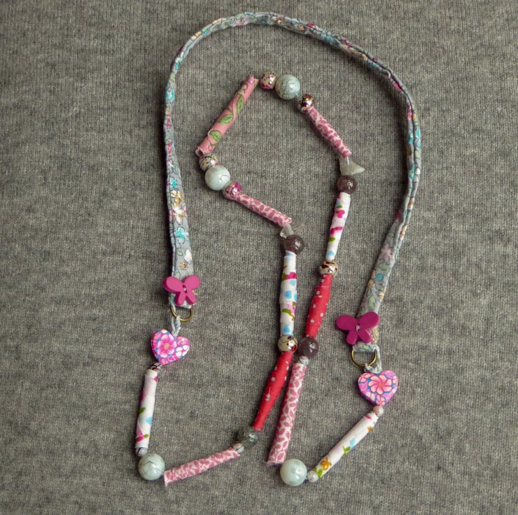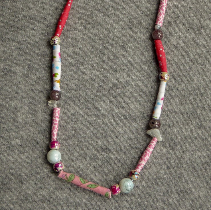 I love to invent ways to use fabric creatively. I am really pleased with my lightweight, comfy, hand made fabric bead necklaces with the little added sparkle of decorative gemstones, glass, stone and acrylic beads. I hope you love them as much as i have enjoyed creating them.