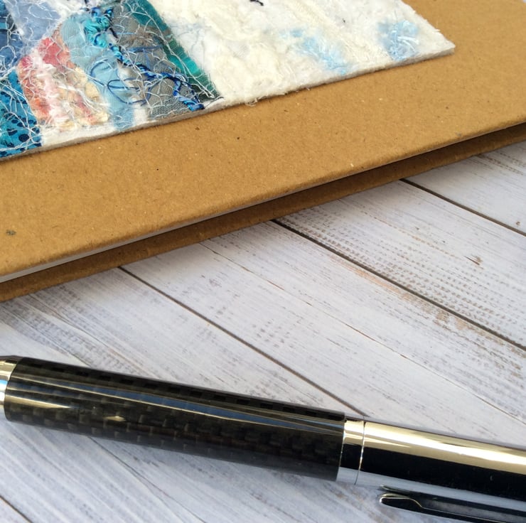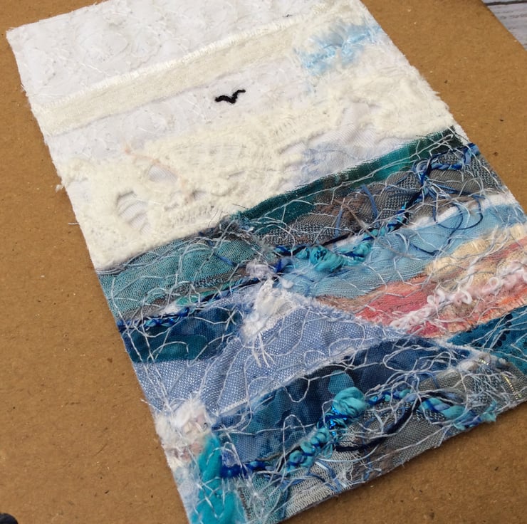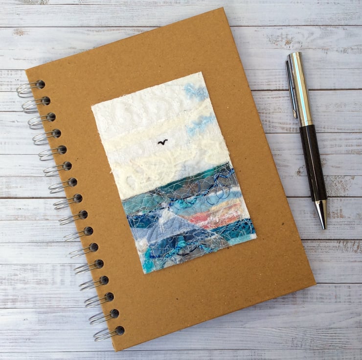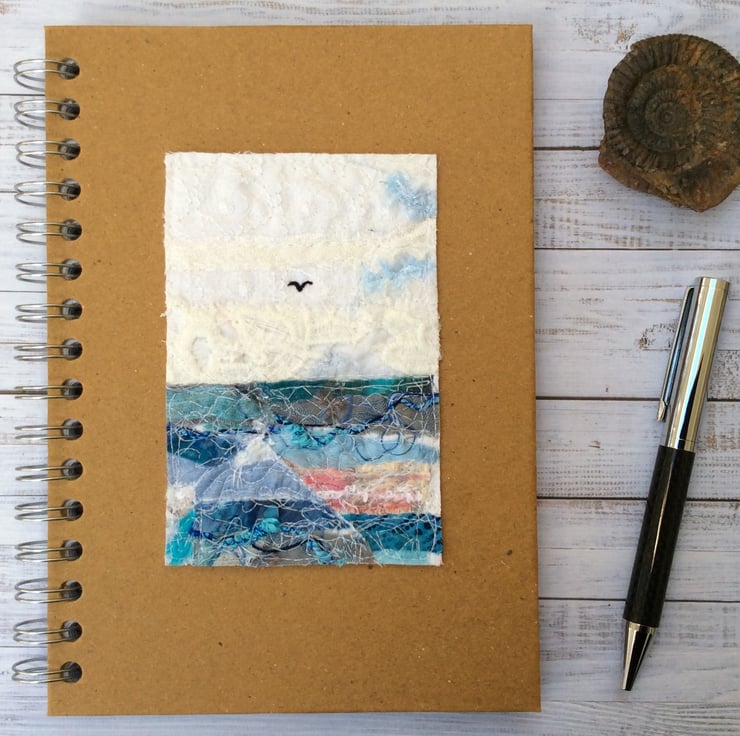 This recycled brown spiral bound hardback notebook has been enhanced with a beautiful seascape with a lone bird flying. It’s made with recycled silk ribbon and lace etc. and enhanced with free motion embroidery. It’s ideal for making notes, journalling, lists or doodling, and will neatly fit a handbag. The wire A5 notebook measures 15.5 x 21.5cm, contains 80 pages (160 sides). The artwork measures approx. 10.5cm sq.