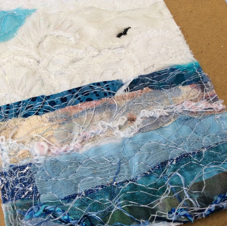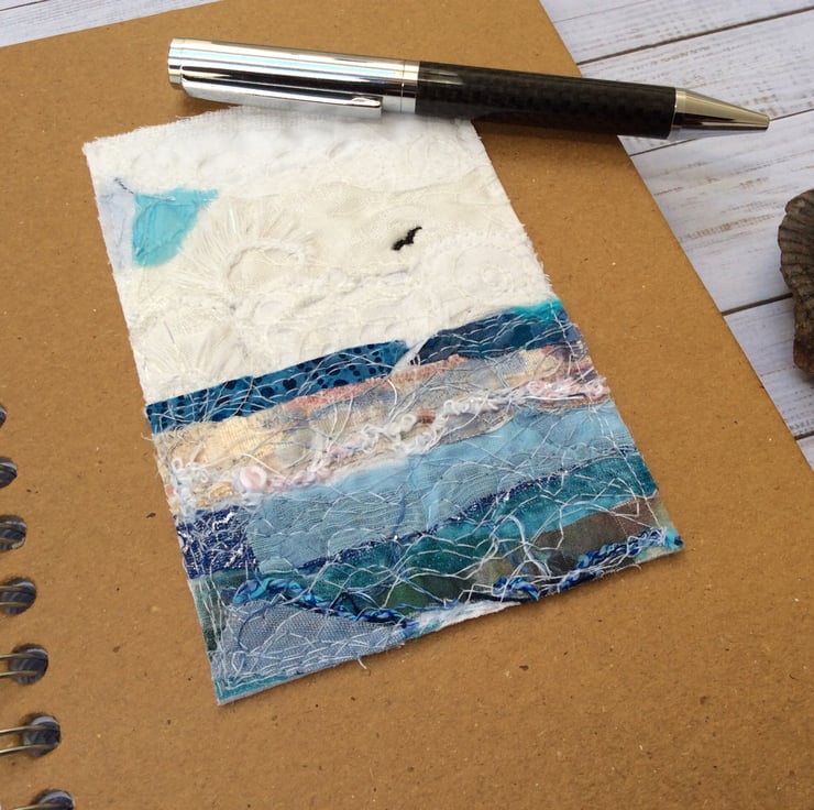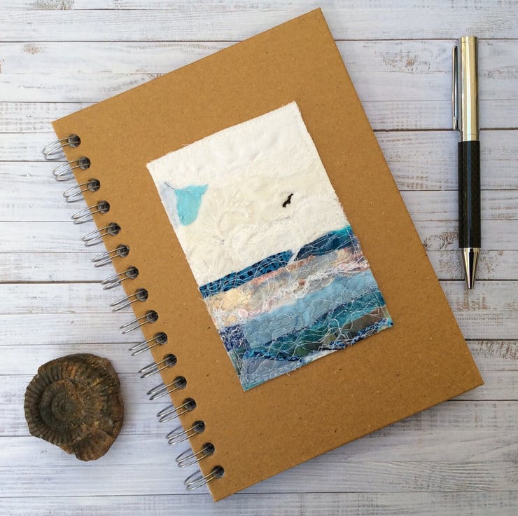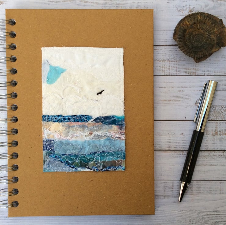 This recycled brown spiral bound hardback notebook has been enhanced with a beautiful seascape with a lone bird flying. It’s made with recycled silk ribbon and lace etc. and enhanced with free motion embroidery. It’s ideal for making notes, journalling, lists or doodling, and will neatly fit a handbag. The wire A5 notebook measures 15.5 x 21.5cm, contains 80 pages (160 sides). The artwork measures approx. 10.5cm sq.