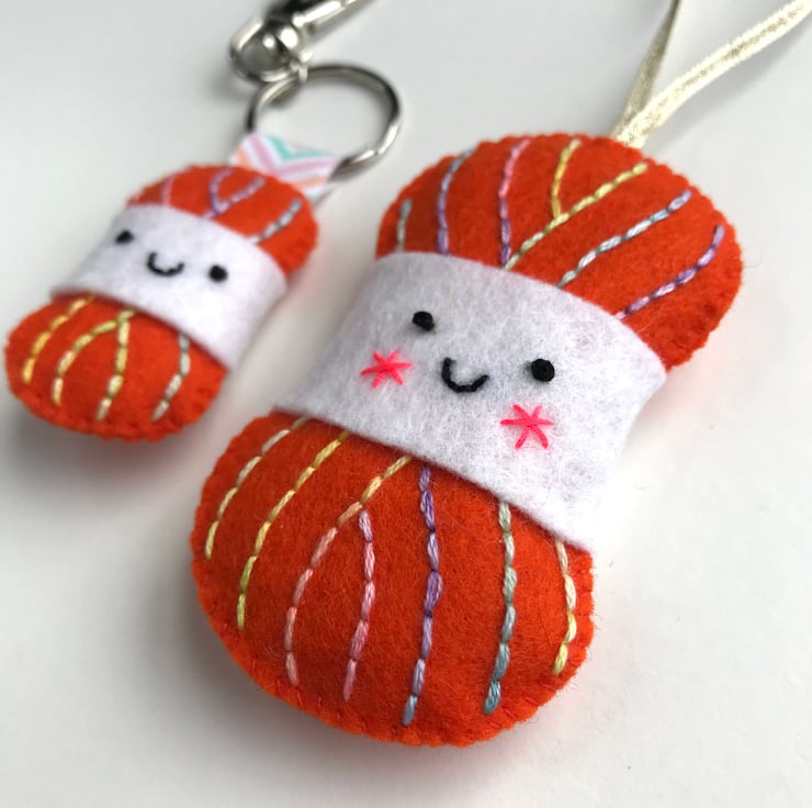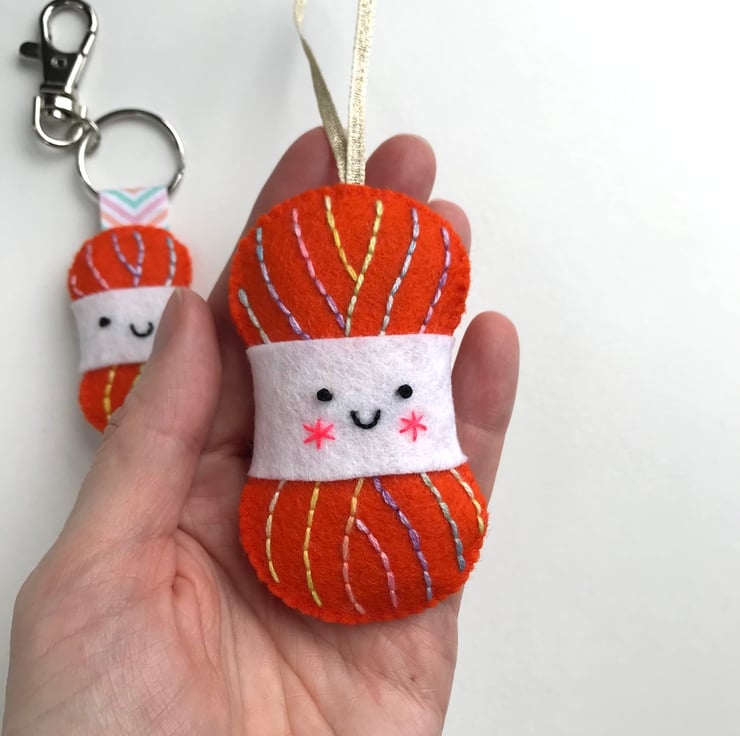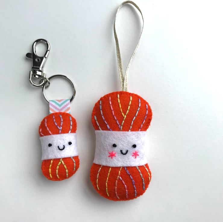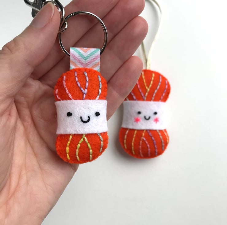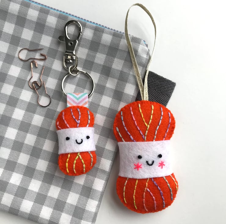 Each yarn ball is hand stitched with multicoloured embroidery threads, onto 100% wool felt. The large yarn ball is stuffed with lavender and a little toy stuffing. On the keyring, the ribbon loop is also held in place with glue and hand stitching.