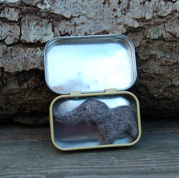 The elephant measures 6 cms and sits snuggly inside a small tin. The tin has been used previously and is not new.