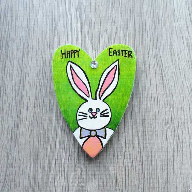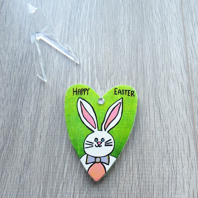 It has been hand painted with acrylic paint. A green variegated background gives the appearance of grass and a happy white Easter bunny, with a lilac and gold trimmed bowtie, has popped up to say ‘HAPPY EASTER’.