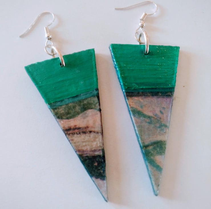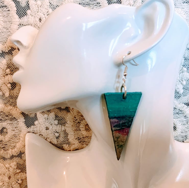 Contemporary geometric wood earrings. Long triangles, light weight. Decoupaged and hand painted in shades of teal blue greens pinks and a hint of purple. Sealed with a protective varnish. All ear wires are alloy and nickel free on strong white metal jumprings.