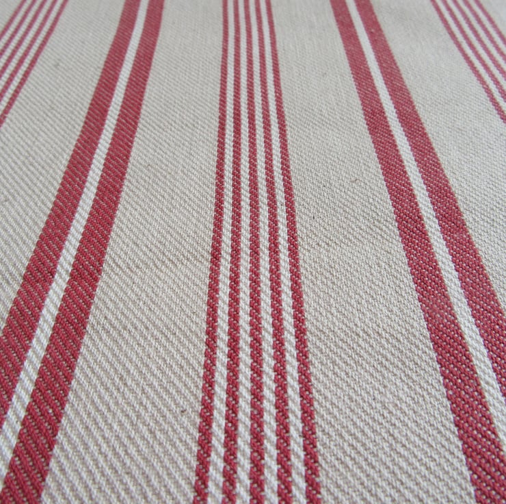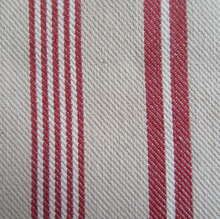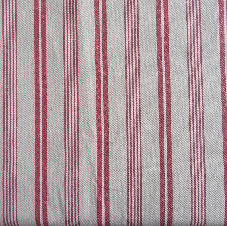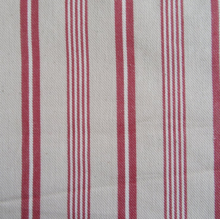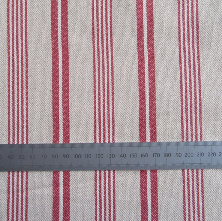 A curtain weight striped twill fabric remnant in a light beige background with cranberry red stripes in various widths. A standard 132cm wide X 140cm long. Ample yardage for small projects such as cushions, tote bags or to cover a small stool. Also Christmas stockings and decorations.