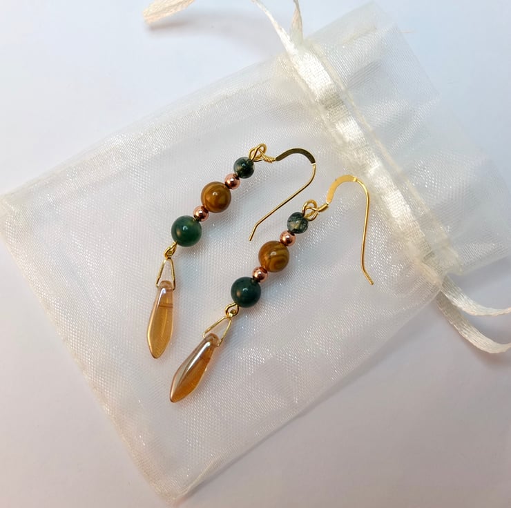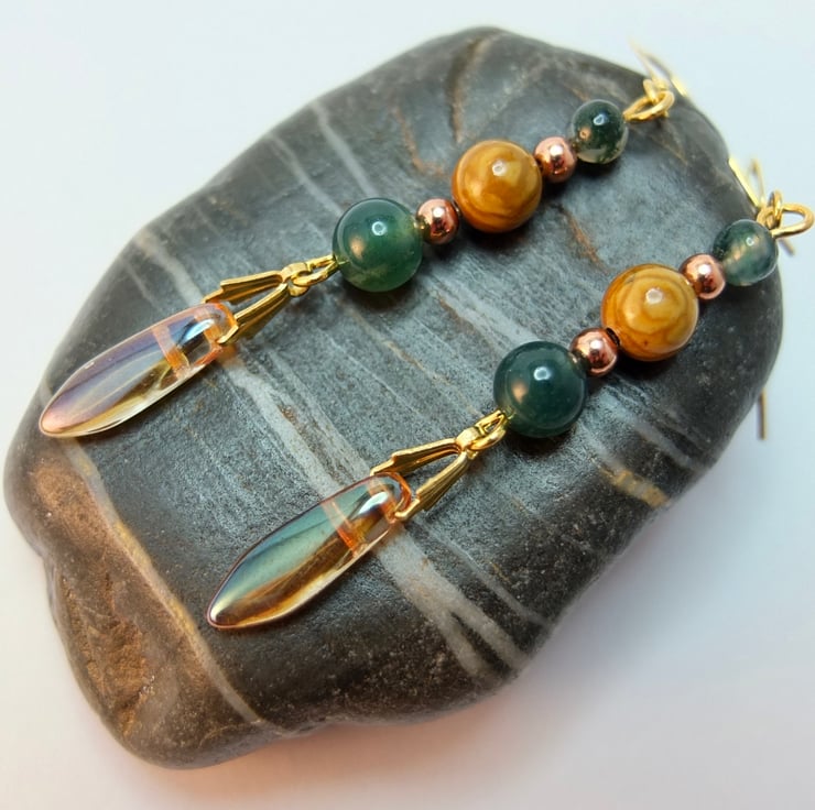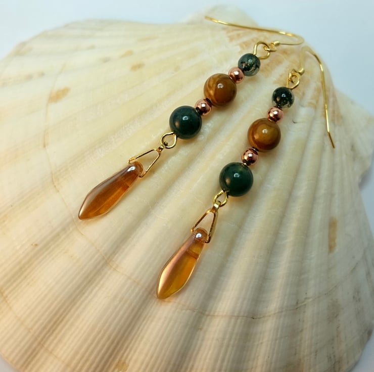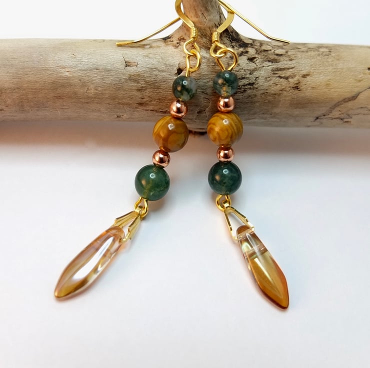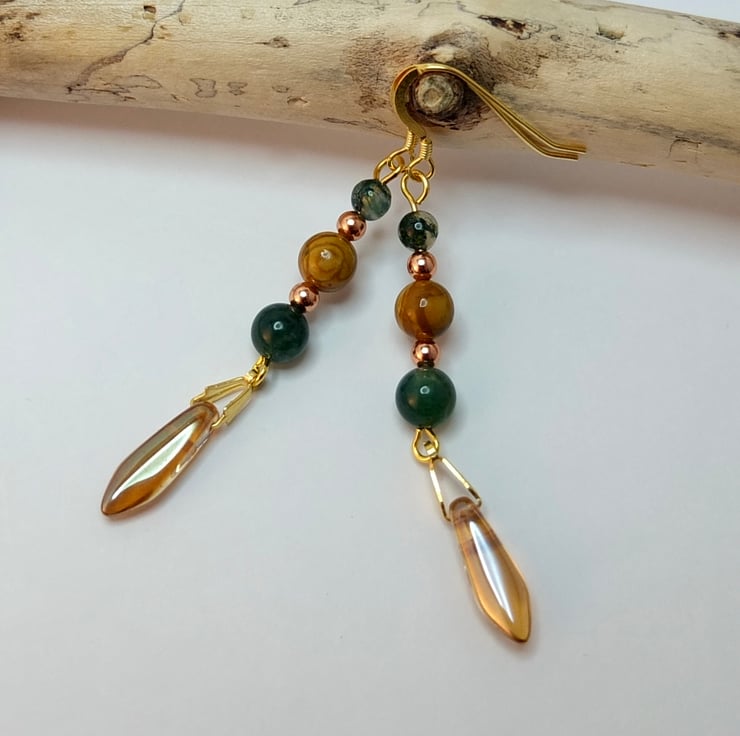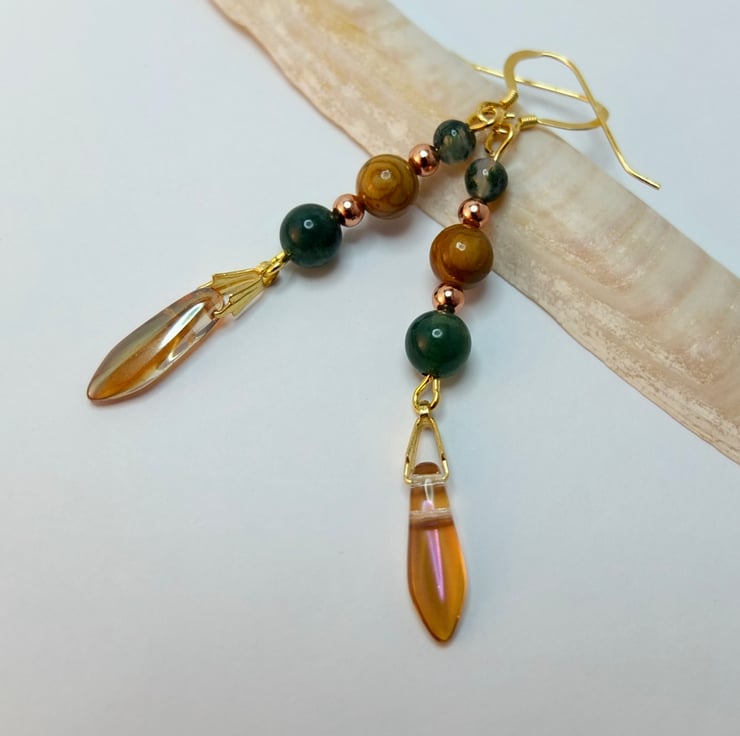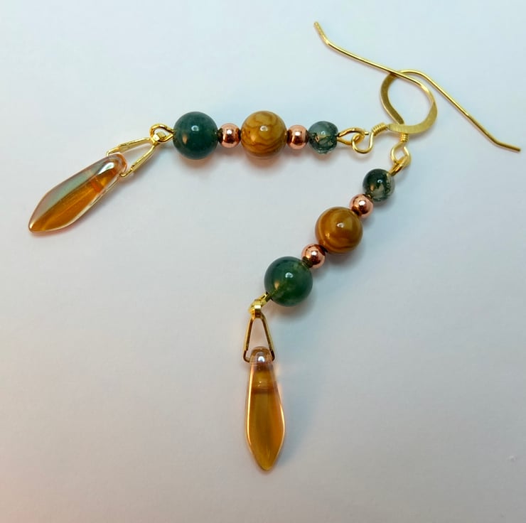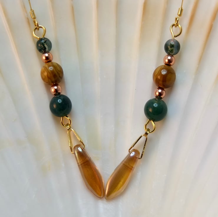 A Czech glass amber-coloured dagger hangs below 6mm beads of moss and wood lace agate, and a 4mm moss agate bead, separated by 3mm copper rounds.