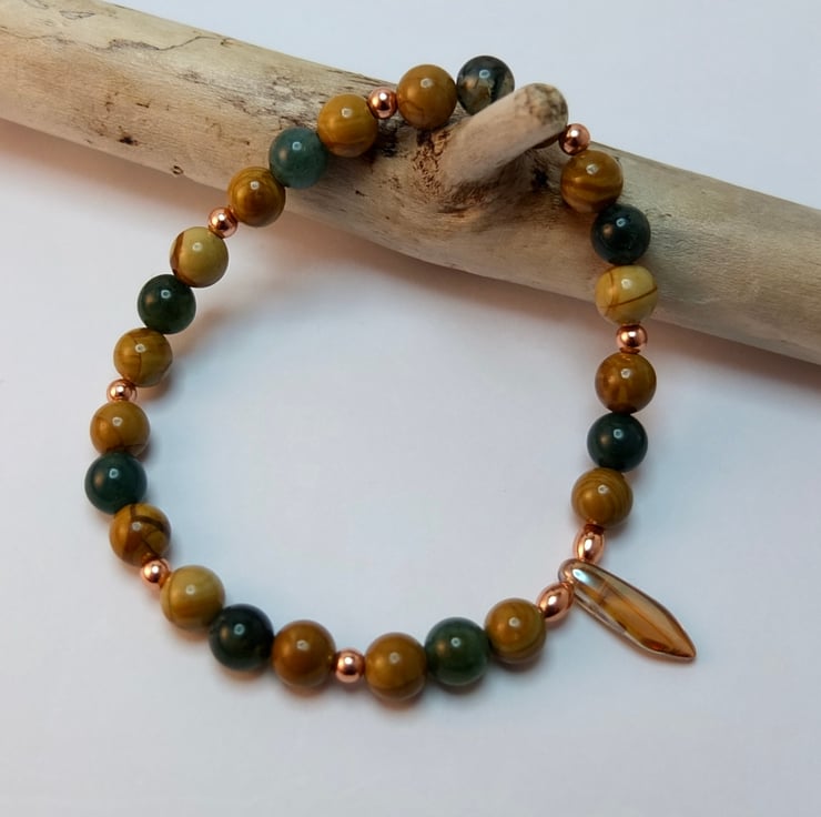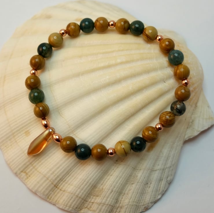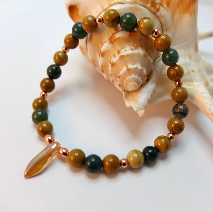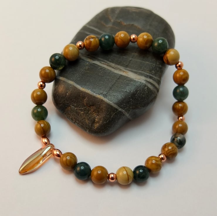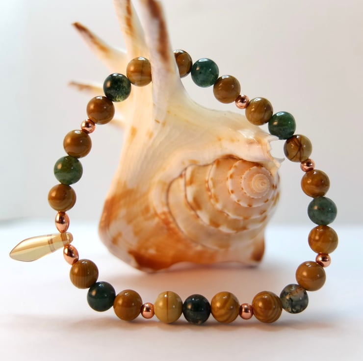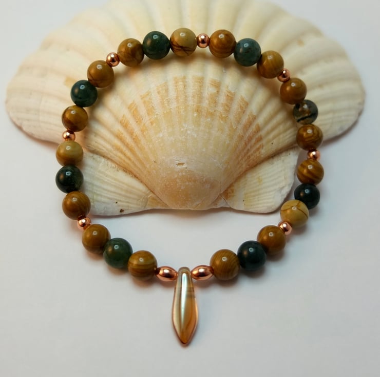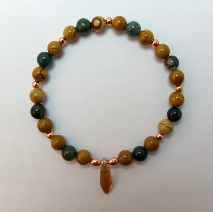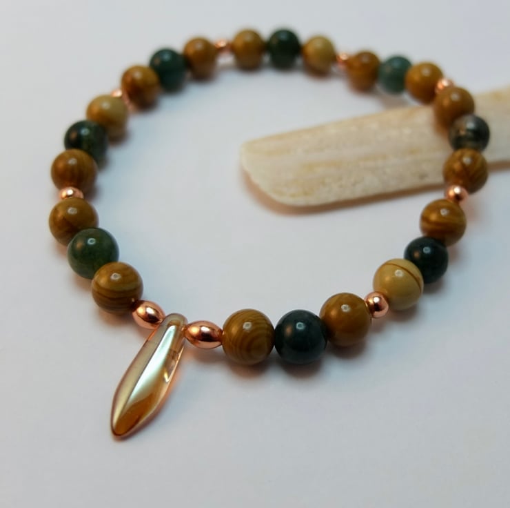 Polished 6mm beads of moss agate and wood lace agate are embellished with 3mm round and 5mm oval copper beads and a 15mm x 5mm amber-coloured Czech glass dagger.