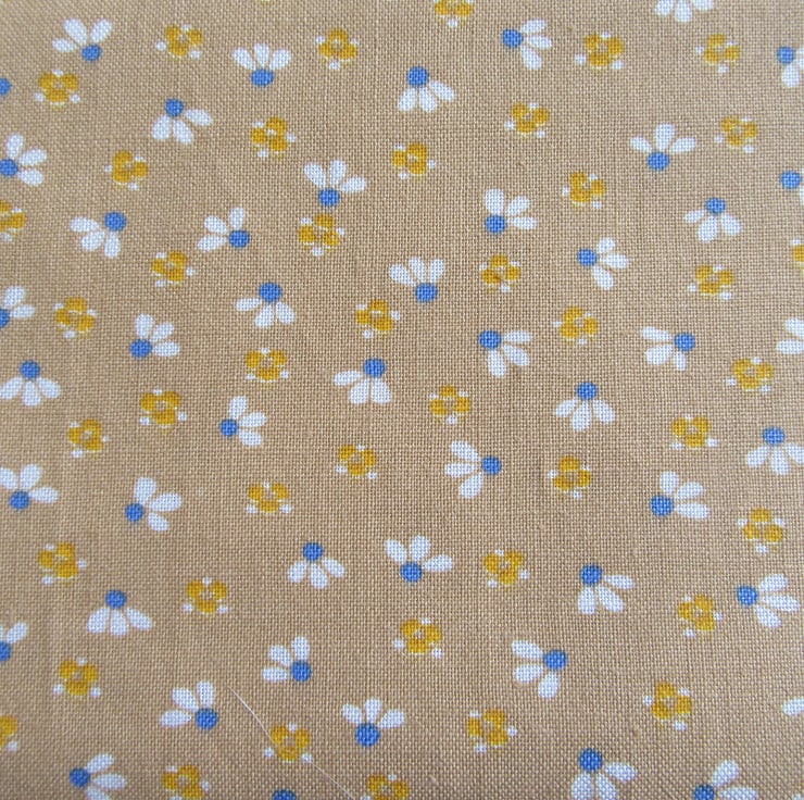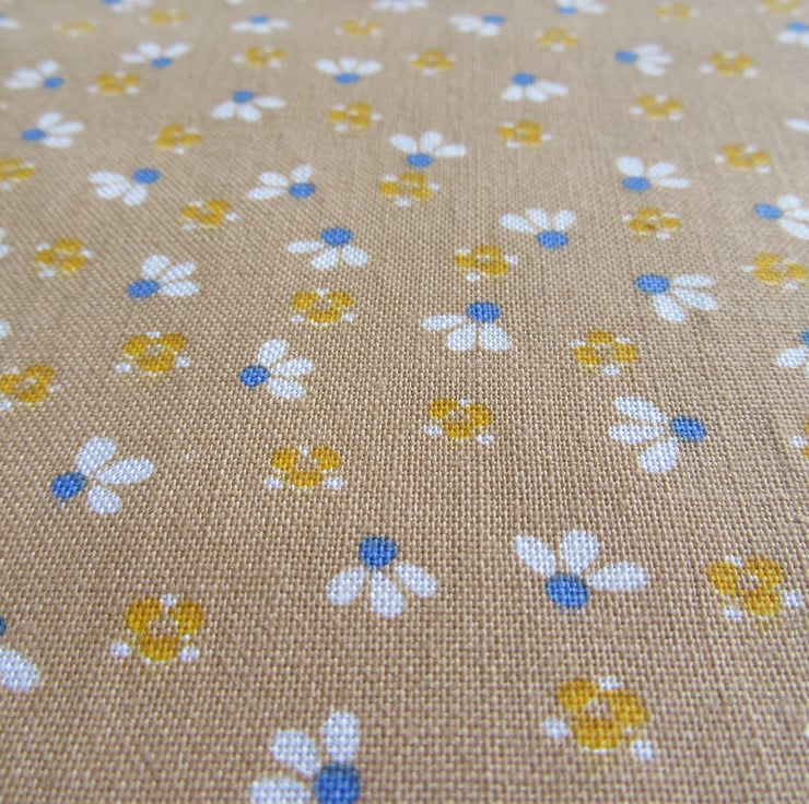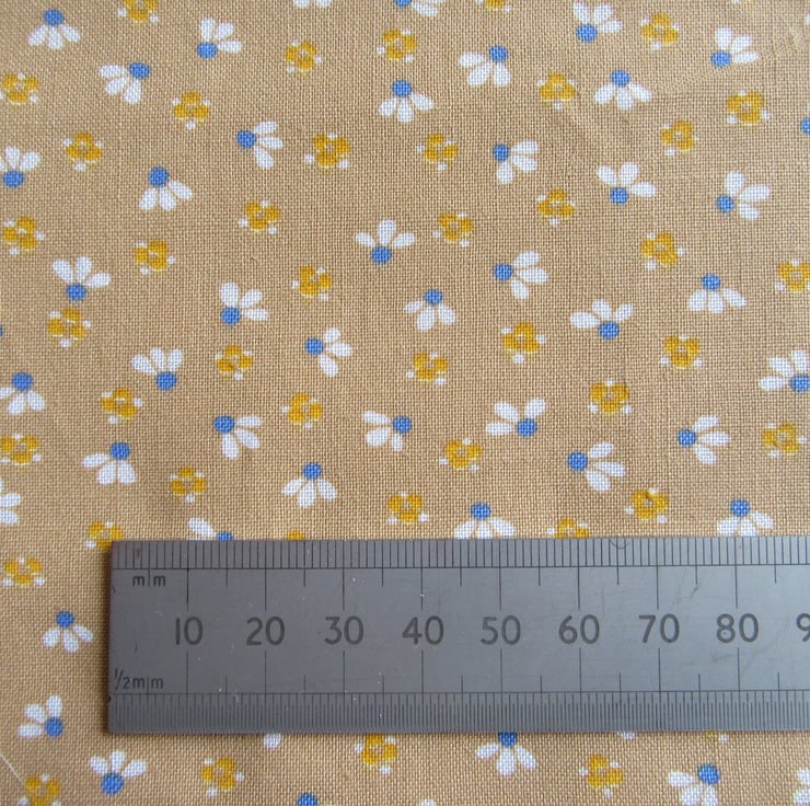 A remnant of printed ditsy floral cotton fabric. A mustardy beige background with printed tiny blue and yellow flowers scattered all over. 85cm wide X 90cm long. A lovely cotton dress weight fabric perfect for small decorative projects.