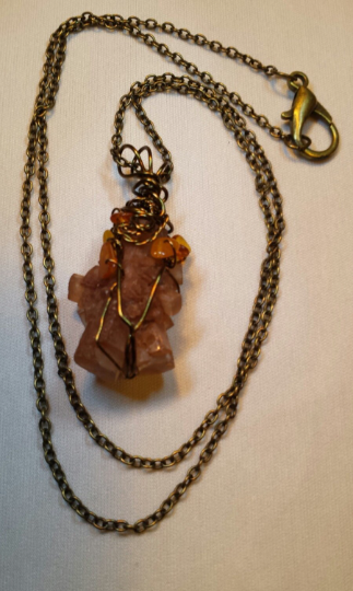 Here is a handcrafted raw Aragonite necklace pendant. It's got a wonderful texture, and is a soft orange-brown colour. It has been wrapped with antique bronze silver-plated wire, which has been designed with swirls and curves to compliment the varied textures of the stone.