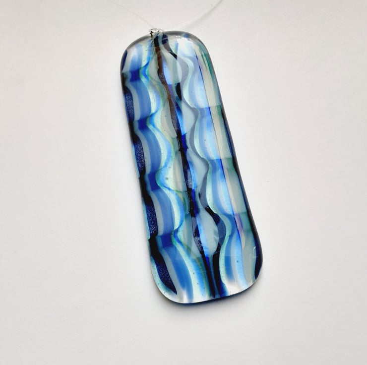 A beautiful shades of blue suncatcher. This has been made using stringers and the optic technique. I've fused a high temp hook into the glass so it can be hung easily.