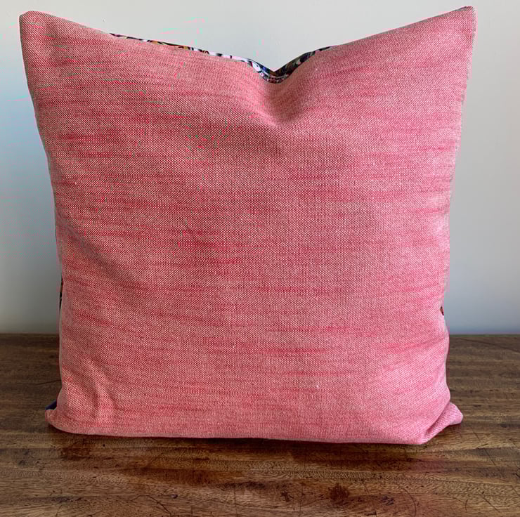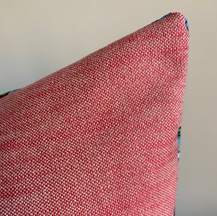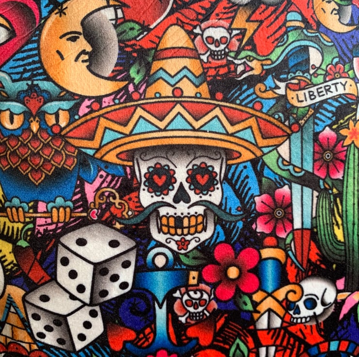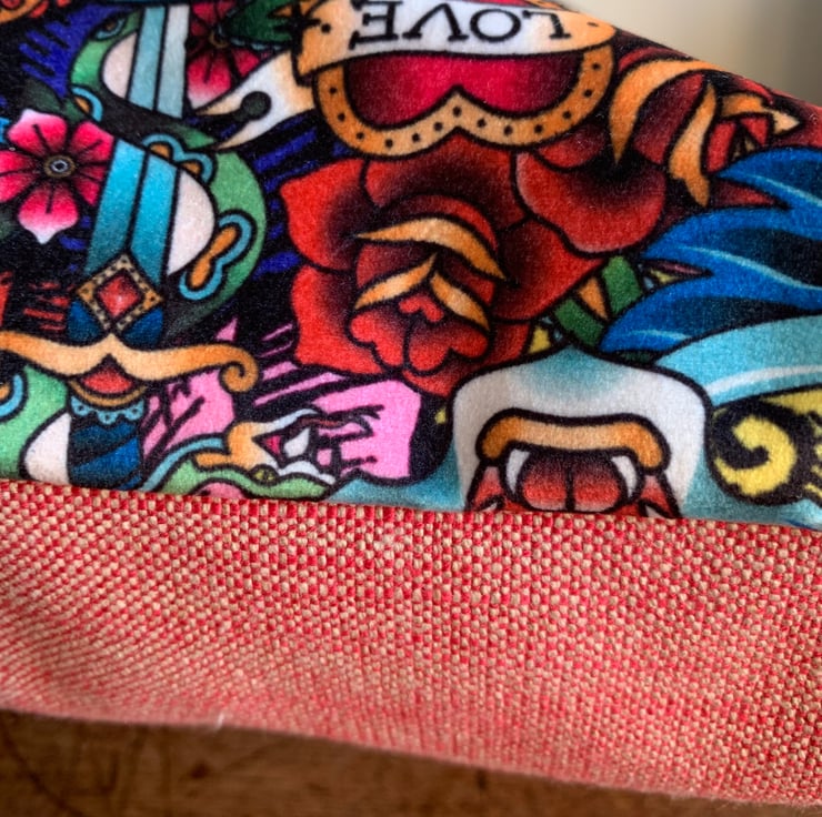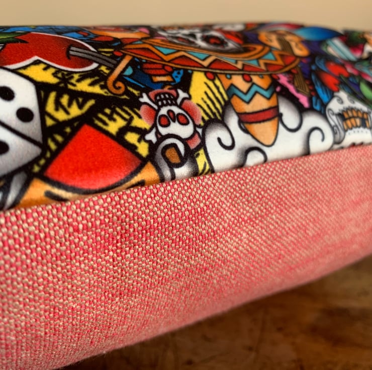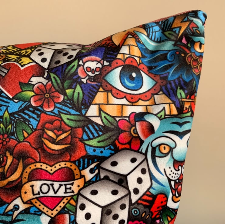Colourful cushion cover in bright tattoo design velvet with plain woven red backing. There is so much to see in this design with sugar skulls, dice, hearts and flowers.