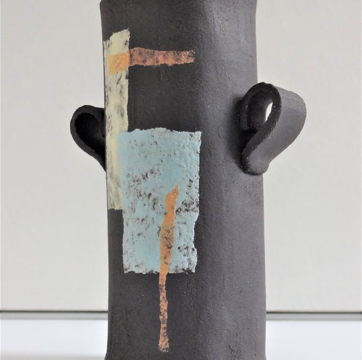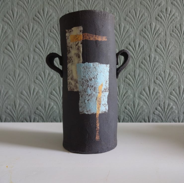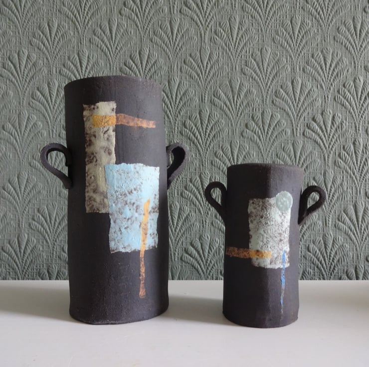 This handmade small vase with two handles and a mid century modern abstract motif is a lovely addition to your living space or kitchen. The vase (called Beatrice) can hold a bunch of fresh herbs in your kitchen, create a focal point for a single small bloom, or a spray of cheery buttercups in your bathroom. The outside of the vase is matt black natural clay finish, which I decorate with an abstract design before firing. The motifs, in pale blue, lemon, and yellow ochre is a one off original design, inspired by abstract art and textiles of the 20th century. Inside is gloss glazed with rust-red and blue highlights. Underneath you’ll find my potter’s mark of a swallow. 11 cms high and 5 cms diameter. One of the images shows Beatrice with a smaller pal, Betsy and they make a pretty pair!