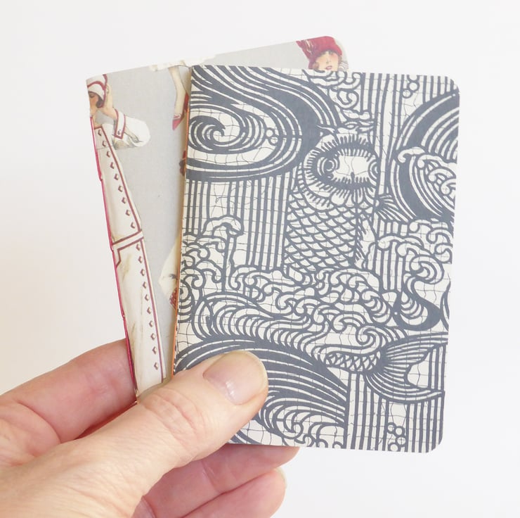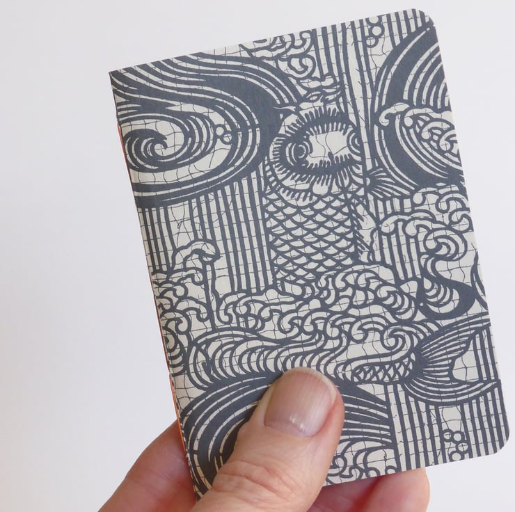 A handmade A7 notebook, with a striking cover of black Japanese Katagami fish pattern, made up with fine grain acid-free paper cut to size and stitched together with a traditional handstitched chain stitch linen thread binding.