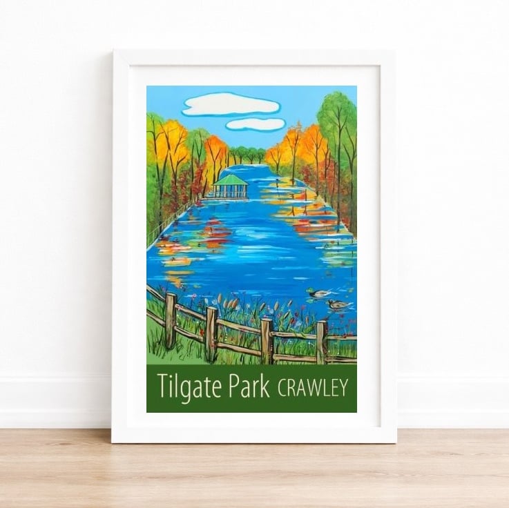 A contemporary travel poster style print of Titmus Lake in Tilgate Park, Crawley, West Sussex, from my own original acrylic painting. A perfect gift for those who love Tilgate Park!