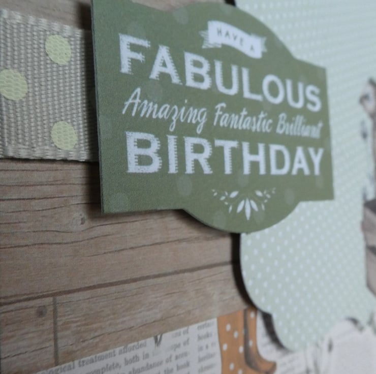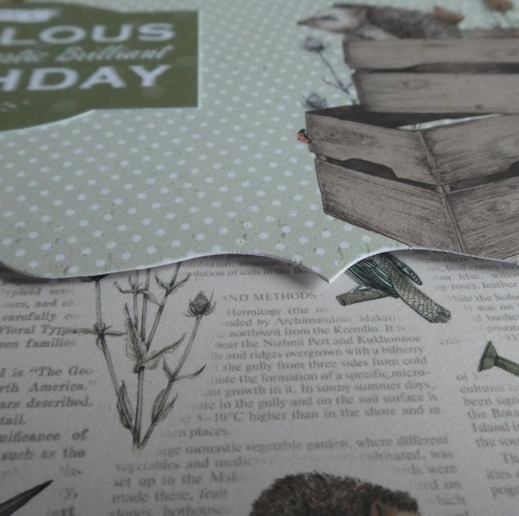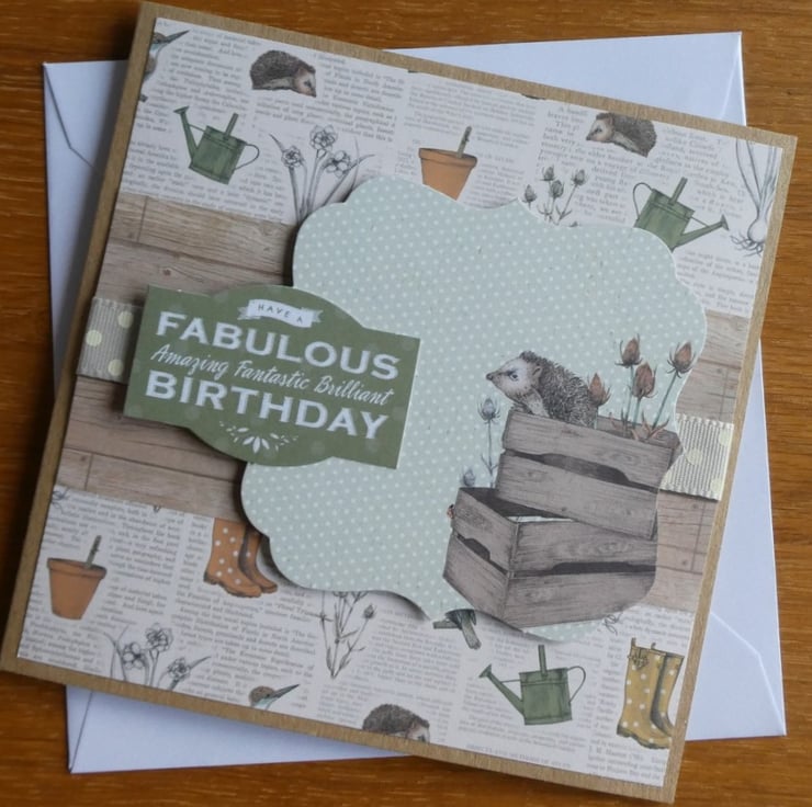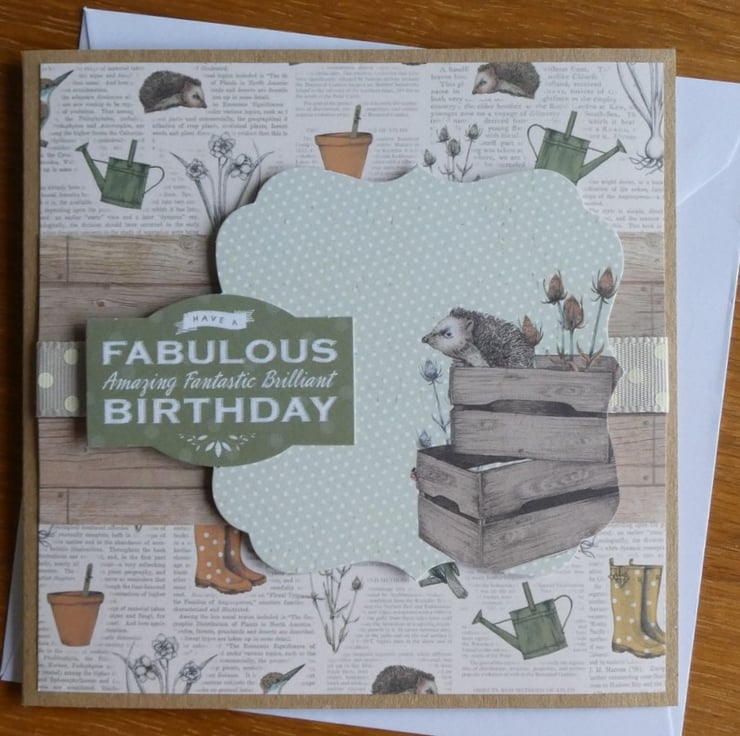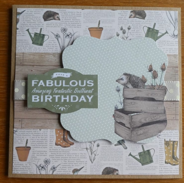 A scalloped topper has been added to the right hand side of the card showing a hedgehog in a pile of old style wooden storage trays. A message saying 'Have a fabulous, amazing, fantastic, brilliant Birthday' has been added to complete the design.