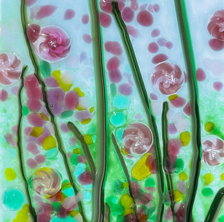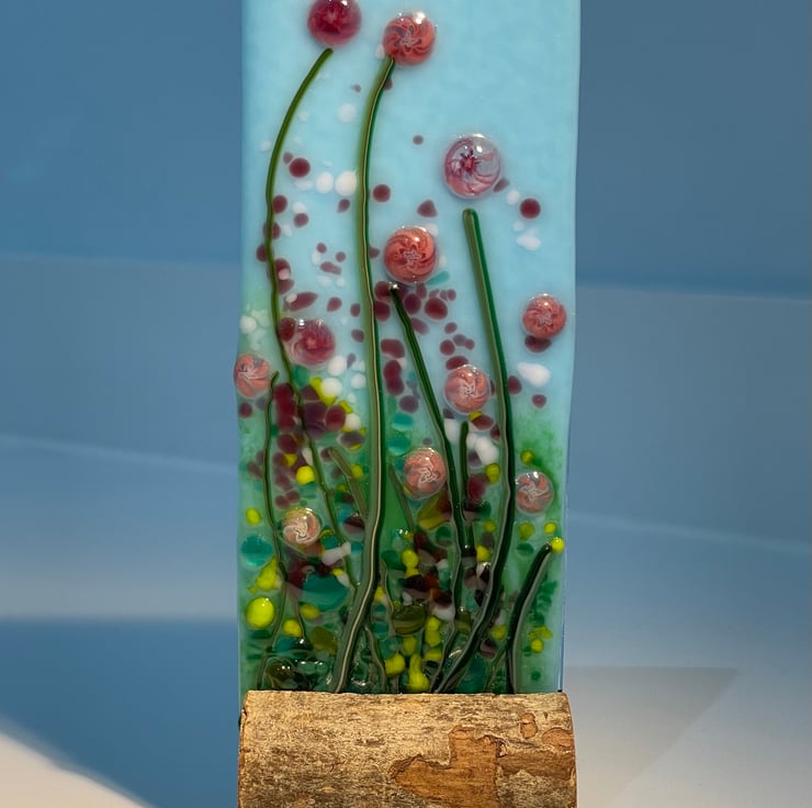 Vibrant fused glass floral display, inspired by cottage garden flowers. Mounted on a handmade wooden stand.