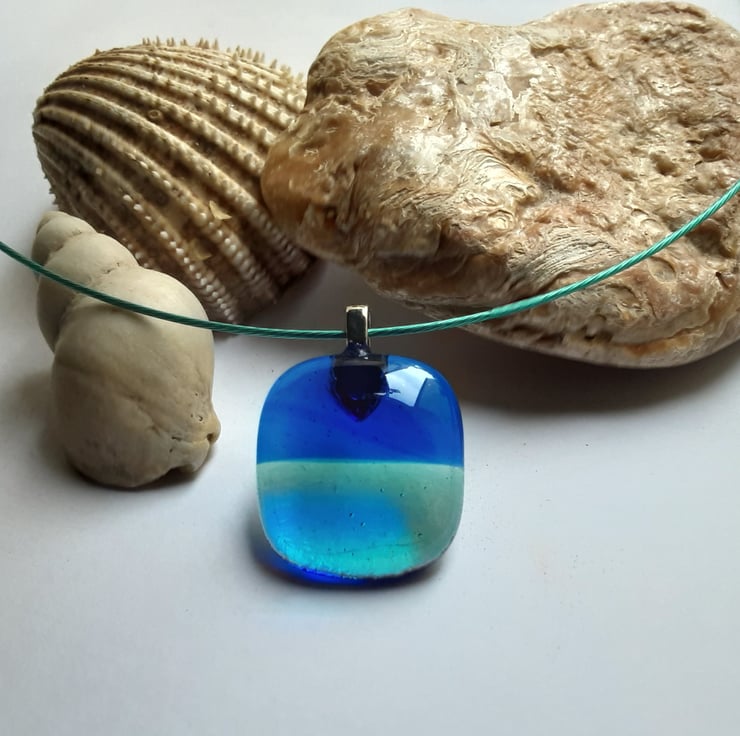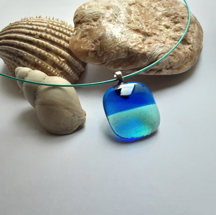 A beautifully simple pendant made from layering Bullseye fused glass in a striped design. It comes on a 18" turquoise memory wire choker with a screw clasp.