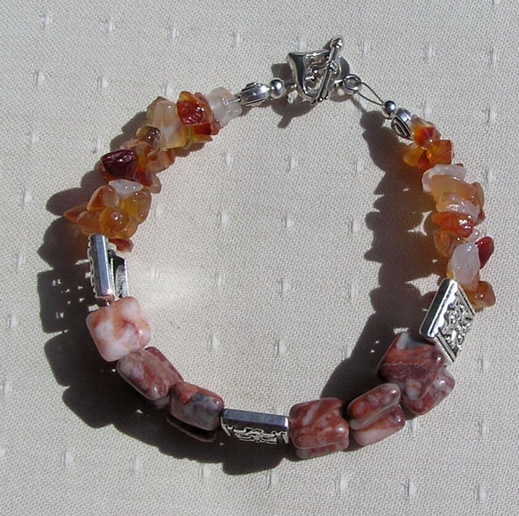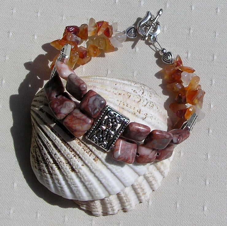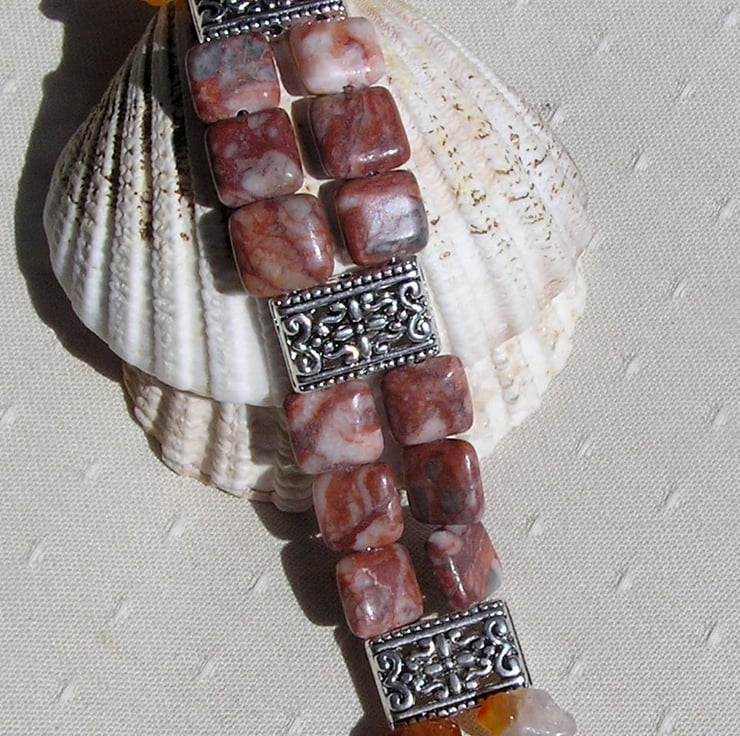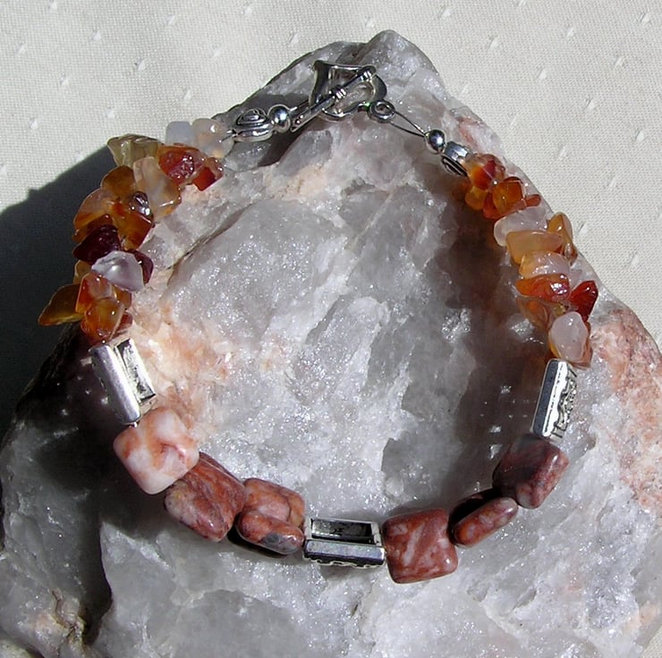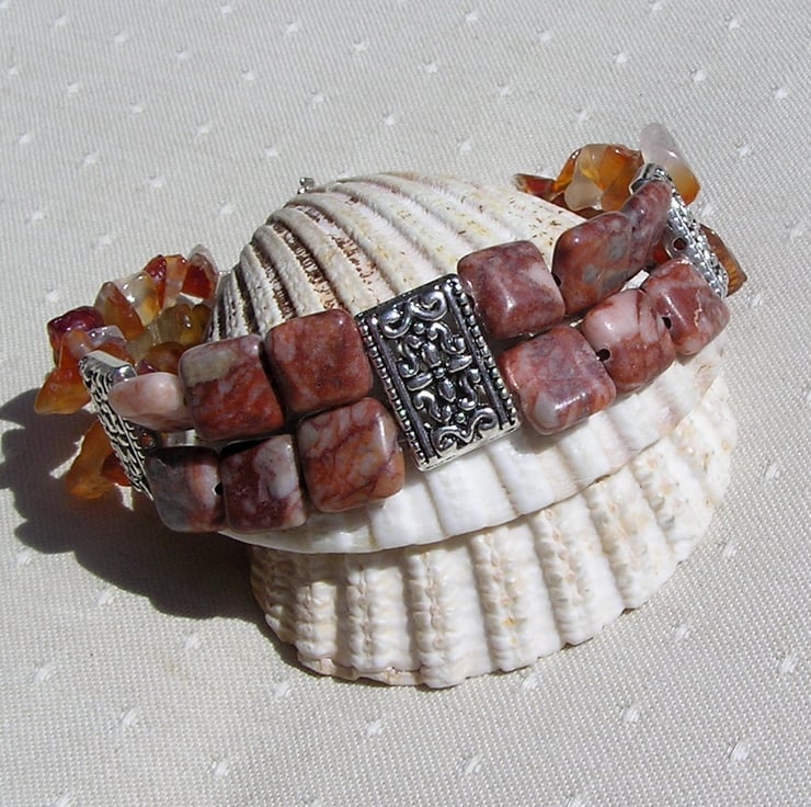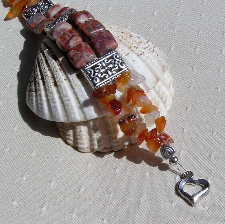 This Stunning Bracelet is made from Stunningly marked Red Picasso Jasper Square Beads and Carnelian Gem Chips… each section separated by an ornately decorated Tibetan Silver Bar Spacer with a tiny Silver Heart at each end - a Beautiful combination that will look stunning either worn casually or with something more Elegant for a Special Evening out