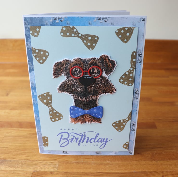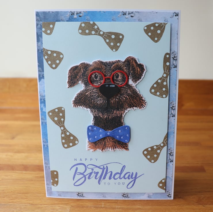 The card base is white and the mat and layer is of small dogs on a blue and white back ground, the second layer I have stamped with a bow tie that the dog is wearing, and I have stamped Happy Birthday To You in blue. The red glasses stand proud on his nose and are a dark red.